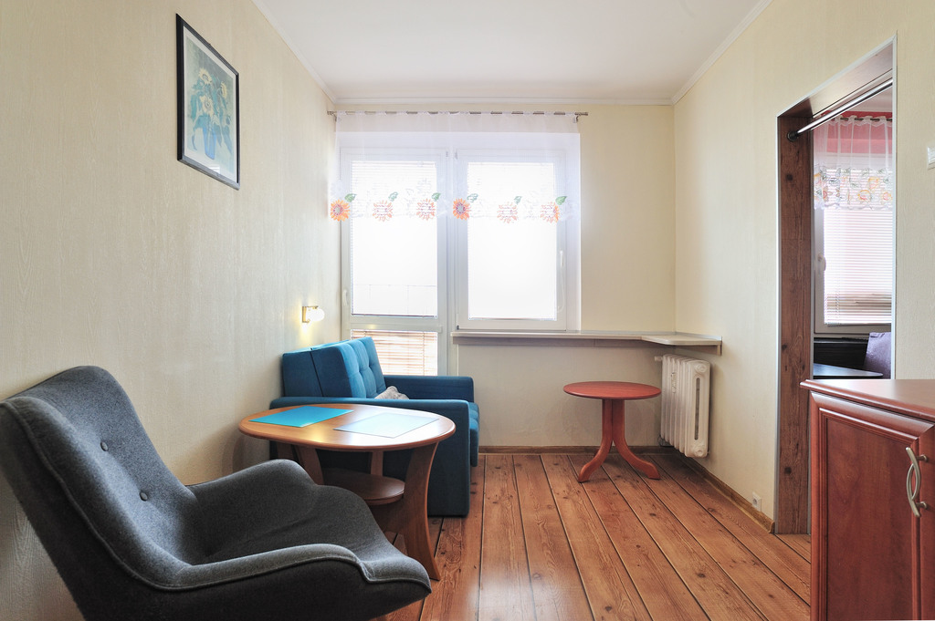 OPIS MIESZKANIA: Do wynajęcia mieszkanie znajdujące się na 7 piętrze XII-piętrowego wieżowca. Jego całkowita powierzchnia wynosi 30,81 m2, jest w pełni umeblowane i wyposażone. W mieszkaniu znajdują się 2 pokoje, w tym jeden przejściowy do oddzielnej słonecznej, wygodnej kuchni. Pierwotnie była to kawalerka, ale została podzielona. W tej sposób mamy część dzienną i część sypialną, ale te pomieszczenia mogą mieć inne funkcje. W pokoju dziennym jest 1 osobowa rozkładana sofa, fotel oraz widoczny stok i komoda. W drugim pokoju jest kanapa, biurko z krzesłem, komoda, stolik oraz bardzo pakowna duża szafa typu komandor.