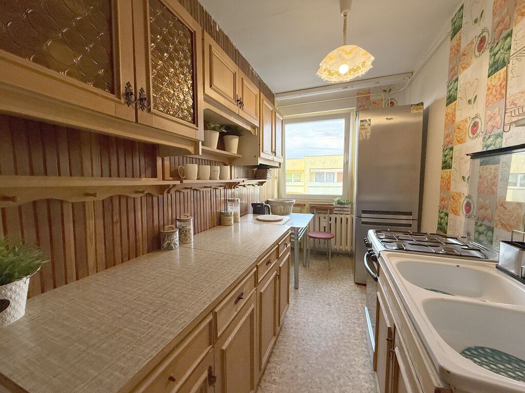 Kuchnia osobna, na podłodze wykładzina PCV, na ścianach drewno oraz tapeta.