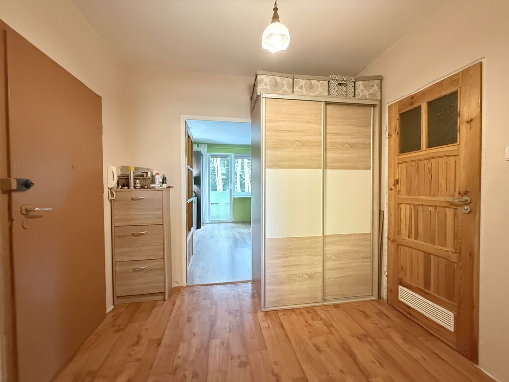 W przedpokoju na podłodze wykładzina PCV, ściany wygładzone i pomalowane.