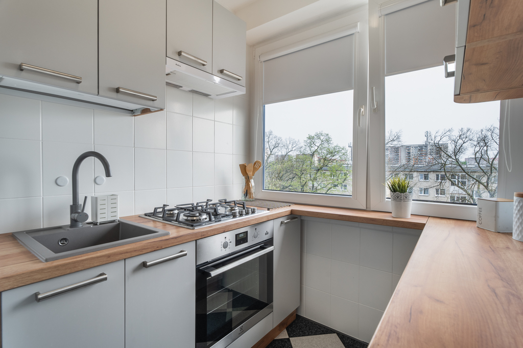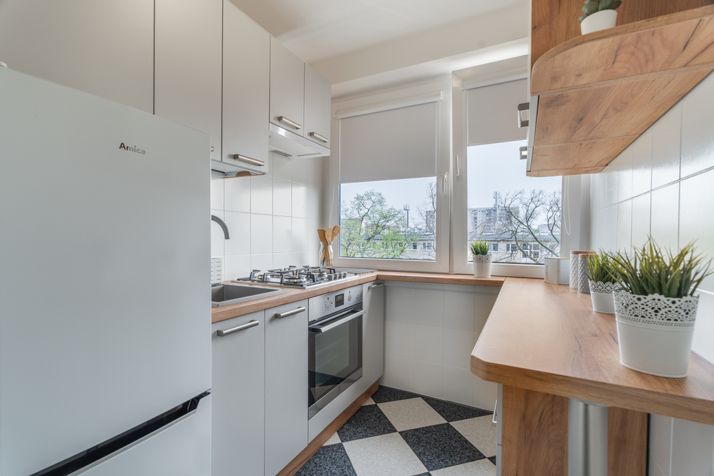 Lokal jest w pełni umeblowany w nowe rozkładane sofy w obu pokojach, komodę, stolik z krzesłami, szafę w zabudowie na korytarzu oraz sprzęty AGD (pralka, nowa lodówka, piekarnik, płyta gazowa, okap). Mieszkanie zostało odmalowane, w kuchni znajdują się nowe meble w zabudowie.