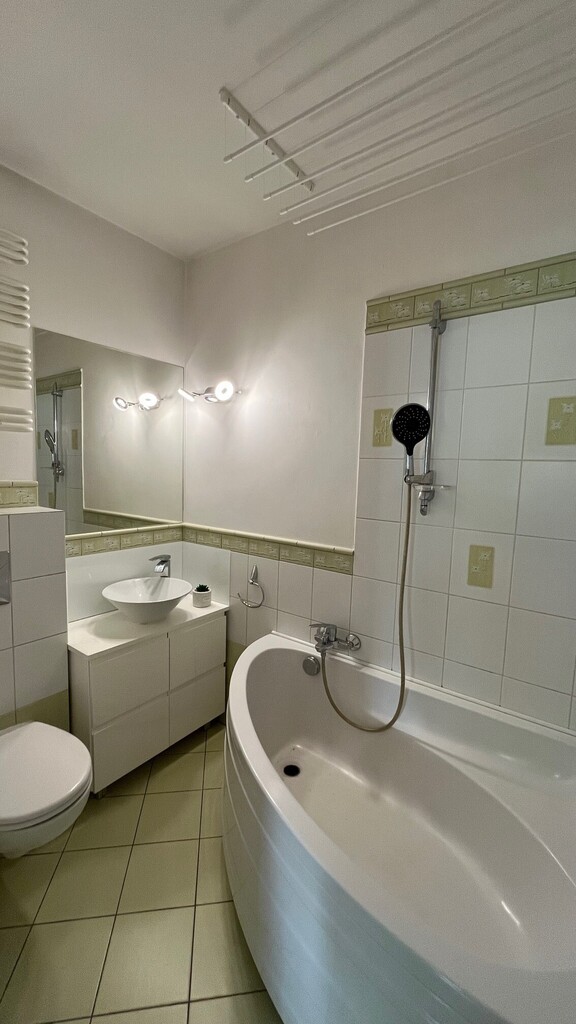 Na podłodze panele i kafle, ściany gładzone malowane. Łazienka z kabiną prysznicową wykończona w glazurze i terakocie.