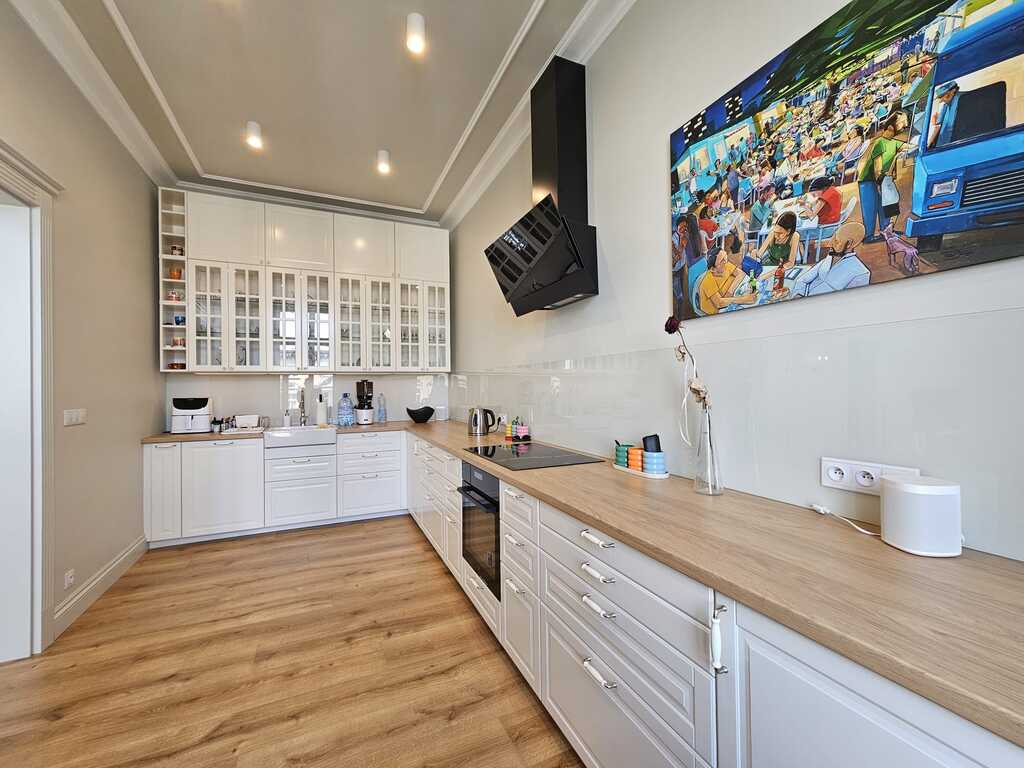 Na podłodze wysokiej klasy panele, w pokojach wykładzina hotelowa, w przedpokoju mozaika. Na ścianach i sufitach liczne gipsowe dekory nadają wnętrzu niesamowitego klimatu. Liczne kinkiety i kryształowe żyrandole podkreślają charakter apartamentu. Robiona na zamówienie stolarka drzwiowa, którą docenią najwybredniejsi klienci.