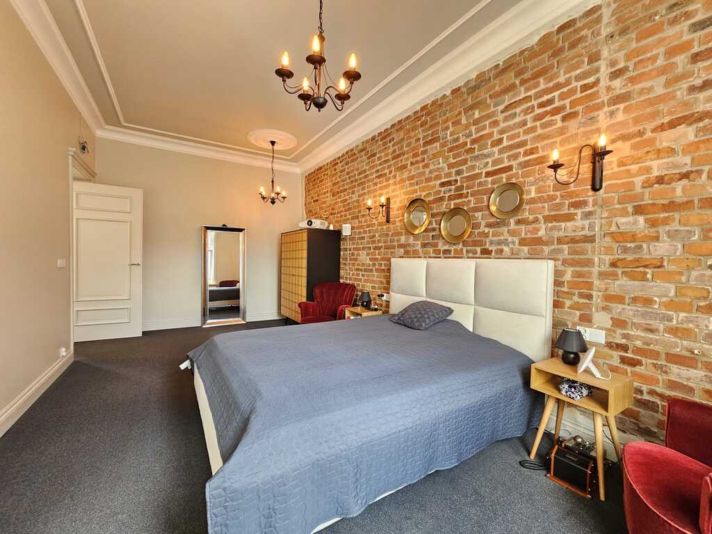 Rozkładowy układ pokoi. Piękny i ogromny salon ok. 50m2, powstały z połączenia dwóch pokoi, bardzo dobrze nasłoneczniony dzięki czterem oknom. Sypialnia z oryginalnie zachowaną ścianą z czerwonej cegły, z miejscem na garderobę i przejściem do prywatnej łazienki z oknem. Mniejszy pokój pełniący funkcję gabinetu. Z salonu przejście do przestronnej w pełni wyposażonej kuchni. Z korytarza wchodzimy do drugiej łazienki, w niej nowy II obiegowy piec gazowy, prysznic, umywalka i wc.