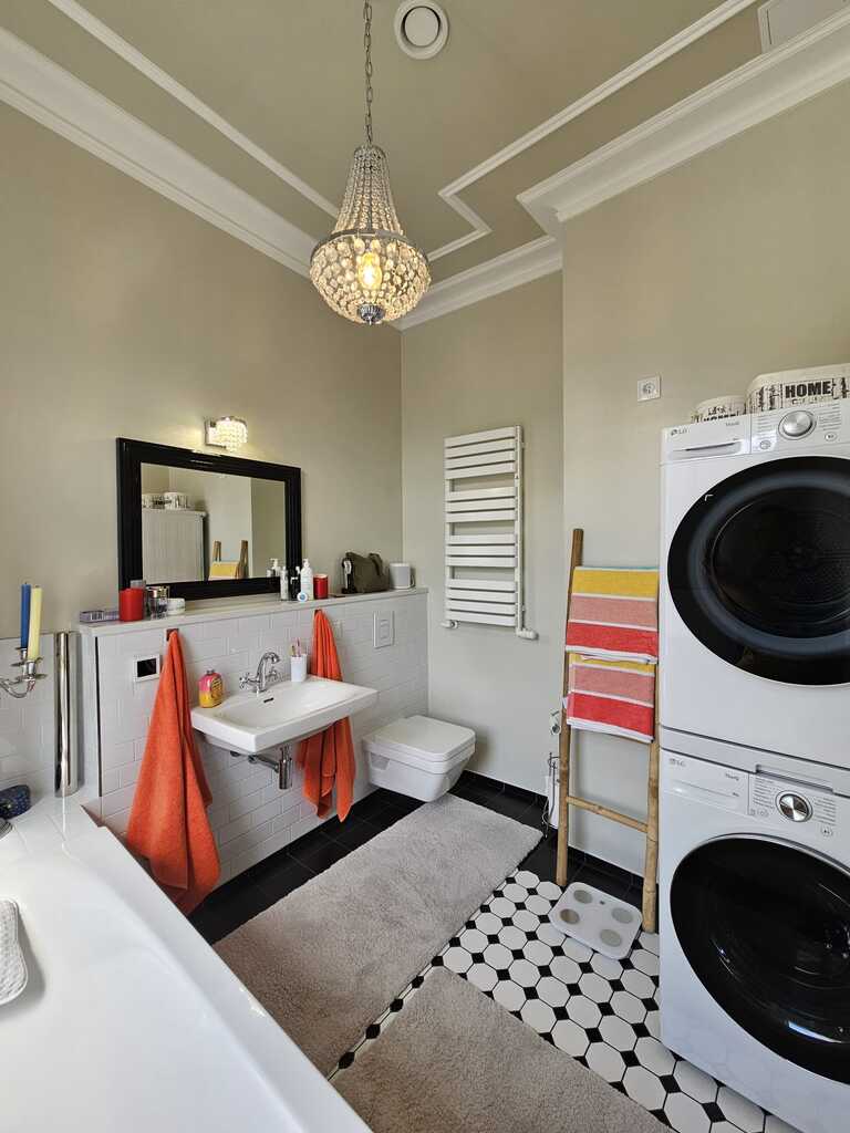 Całość wykończona materiałami najwyższej jakości z dbałością o szczegóły. Nieruchomość po generalnym remoncie. Zostały usunięte stare tynki i położone nowe, szpachlowane ściany i sufity, wymieniona została cała elektryka, instalacja wodno kanalizacyjna, na suficie położona została wełna 20cm oraz folia paro-przepuszczalna, tak jak w nieruchomości piętro niżej, podłoga w sypialni i w gabinecie ocieplona i wygłuszona watą.