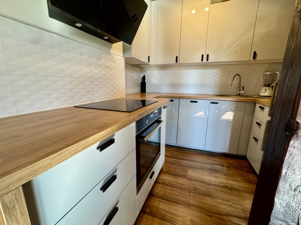 -Na pierwszym poziomie mieści się duży salon z aneksem kuchennym, idealny do codziennego życia i spotkań, jeden dodatkowy pokój oraz łazienka.