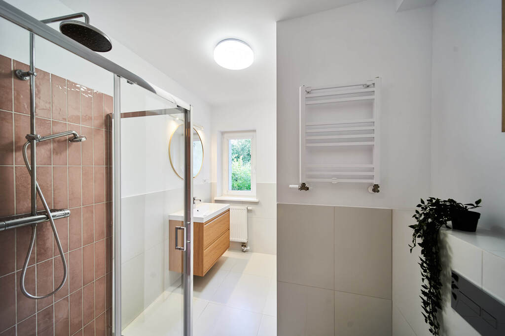 Nowa, kompleksowo wyposażona kuchnia zlakierowanymi frontami, łazienka z elegancką kabiną prysznicową, nowym piecem C.O z zabudową na pralkę oraz suszarkę. Okna PCV, nowe drzwi wewnętrzne.