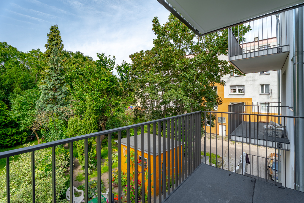 • Ekspozycja zachodnia – okna wychodzą na drzewa, co nadaje wnętrzu wyjątkowego klimatu i zapewnia prywatność. Okolica jest cicha i spokojna, dzięki czemu mieszkanie sprzyja relaksowi po intensywnym dniu. Wieczorami klimatu nada widok zachodzącego słońca.