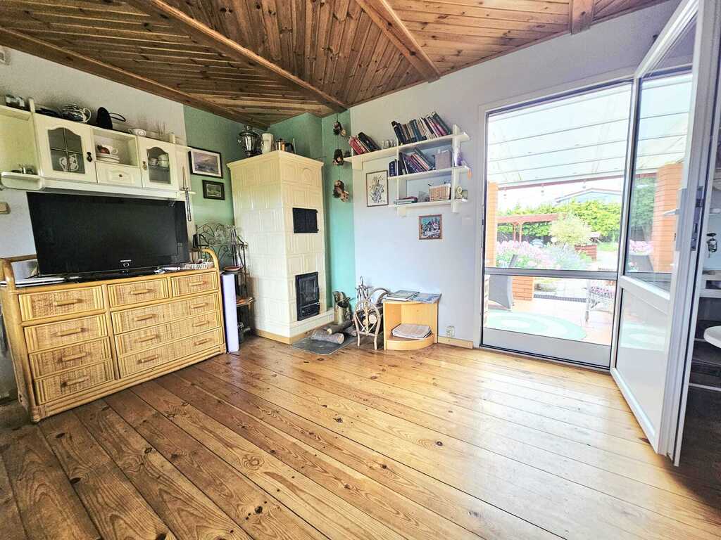 Drewniane podłogi. Domek posiada również dostęp do telewizji i internetu. Umeblowanie, wyposażenie wraz ze sprzętami RTV/AGD - wszystko pozostaje w cenie.