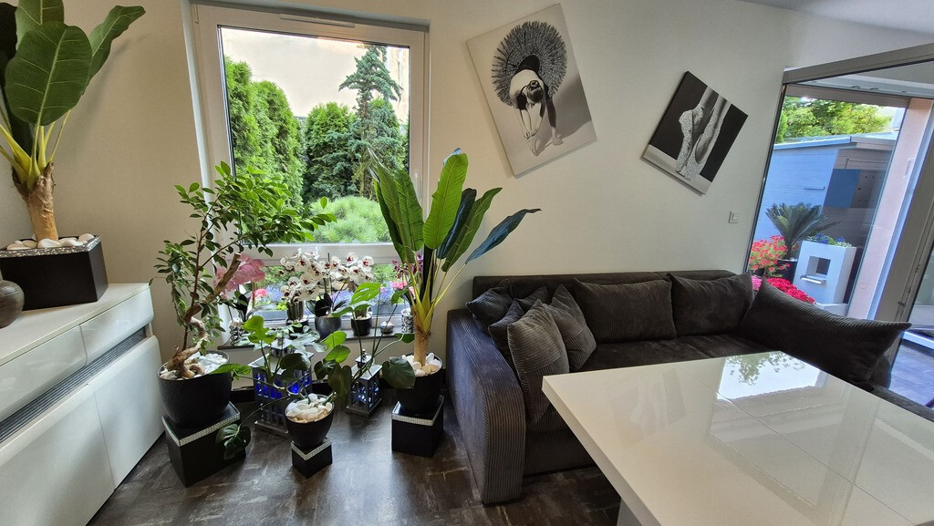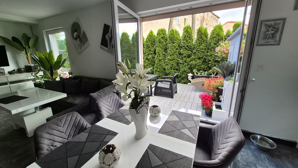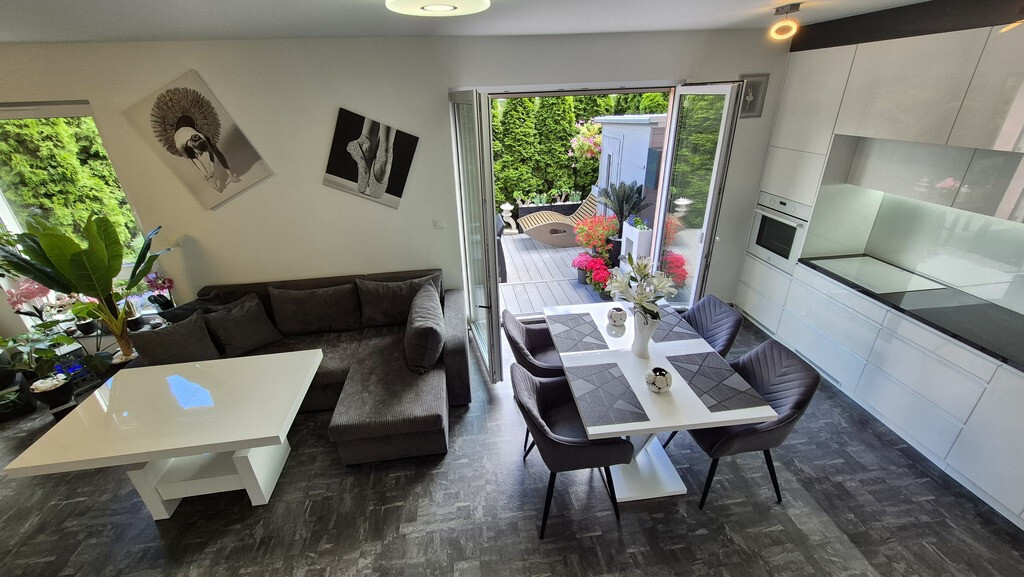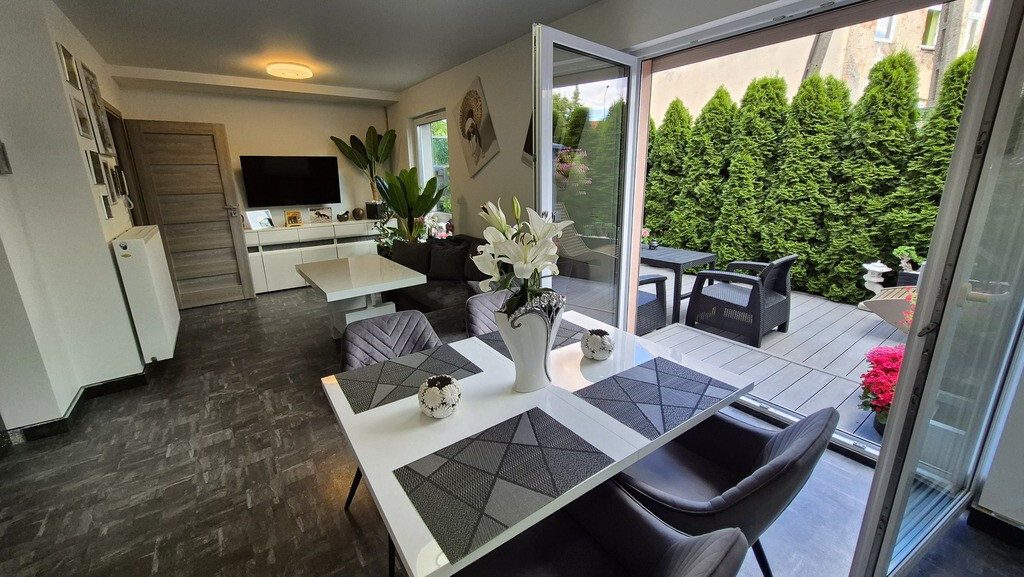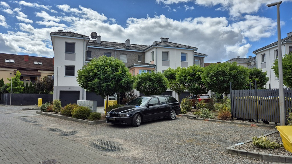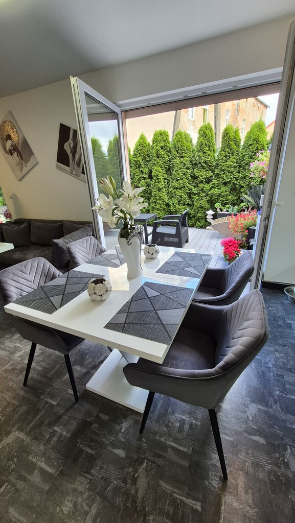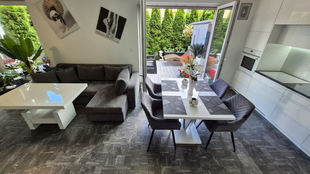 Piękne mieszkanie II poziomowe położone przy ul Braniborskiej na Gumieńcach. Niewielkie zamykane osiedle stanowi enklawę dla mieszkańców. Niskie budynki z cegły wybudowane w 2020 r. Są to " szeregowce", w każdym z nich są 2 mieszkania. Przedmiotem sprzedaży jest lokal do którego wejscie jest z parteru. Drzwi antywłamaniowe, przedsionek z wygodną szafą,WC, po prawej stronie jest wejście do garażu ( 15,38 m2). Salon z kuchnią. Każde miejsce w tm mieszkaniu została idealnie przemyślane, tak , aby mieszkańcom żyło się komfortowo. Piękna duża kuchnia wyposażona w sprzęty AGD, obok niej podwójne drzwi prowadzące do ogródka, który stał się tarasem. Całkowicie odizolowany od zewnątrz roślinnością, jest idealnym połączeniem wnętrza i powierzchni zewnętrznej. Poza wygodnymi fotelami jest dużo elementów architektury ogrodowej . Na tarasie znajduje się również sauna. Gdy mieszkańcy chcą odpoczywać będąc bardziej osłonięci wygodna markiza jest rozsuwana nad całością tarasu. Drewniane schody prowadzą na piętro I. Tu znajdują się 2 sypialnie, oraz duża łazienka z WC. Okno pozwala wygodnie wietrzyć to pomieszczenie. Jest kabina prysznicowa, umywalka, WC, liczne szafki otwierane po naciśnięciu ręką. W jednej z nich jest piecyk gazowy, który pozwala ogrzewać mieszkanie. Rachunki za gaz są niskie. Mieszkańcy lubią ciepło. Latem za gaz rachunki wynosiły ok 50 zł za miesiąc, zimą ok 300 zł W sypialni zamontowany jest klimatyzator. Powierzchnia mieszkania z garażem wynosi 85,69 m2 . Mieszkanie ma 70,31m2, garaż 15,38m2. Dodatkowo w cenie lokalu jest stanowisko postojowe znajdujące się na wprost drzwi wejściowych. W cenie mieszkania może zostać pełne umeblowanie i wyposażenie. Serdecznie zapraszam.