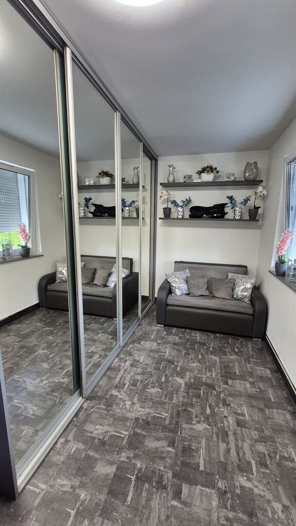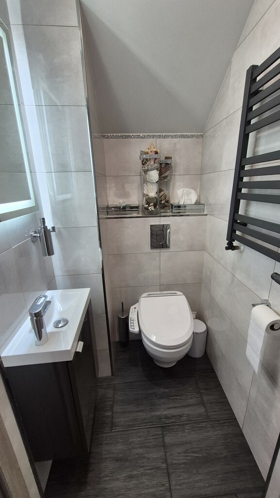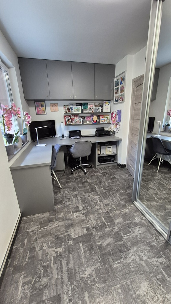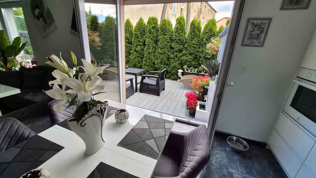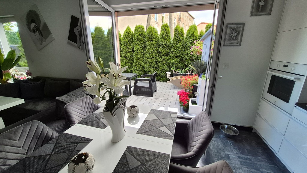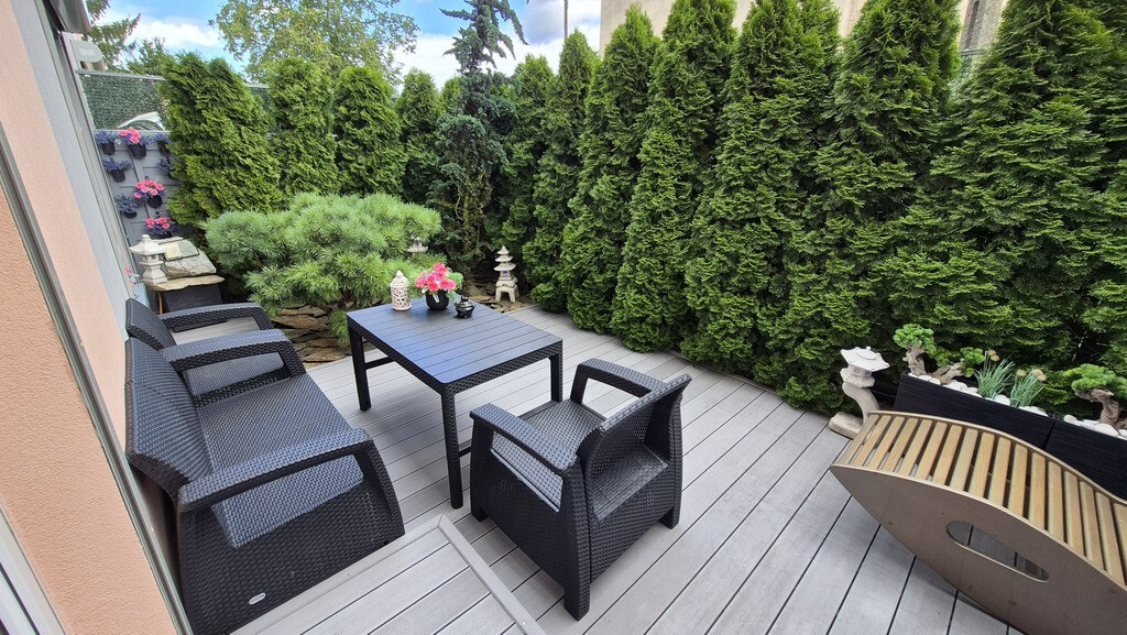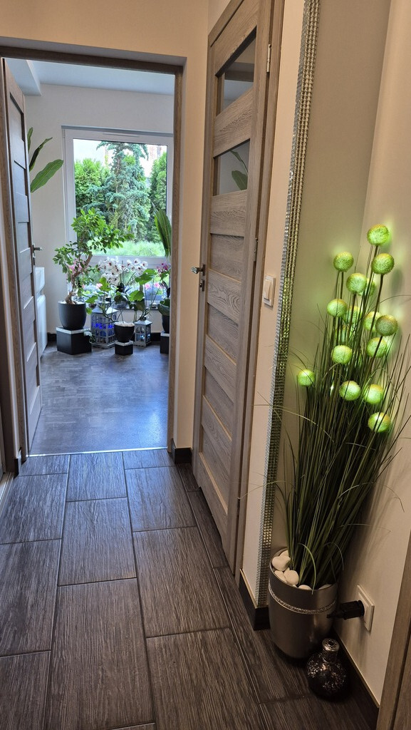 Piękne mieszkanie II poziomowe położone przy ul Braniborskiej na Gumieńcach. Niewielkie zamykane osiedle stanowi enklawę dla mieszkańców. Niskie budynki z cegły wybudowane w 2020 r. Są to " szeregowce", w każdym z nich są 2 mieszkania. Przedmiotem sprzedaży jest lokal do którego wejscie jest z parteru. Drzwi antywłamaniowe, przedsionek z wygodną szafą,WC, po prawej stronie jest wejście do garażu ( 15,38 m2). Salon z kuchnią. Każde miejsce w tm mieszkaniu została idealnie przemyślane, tak , aby mieszkańcom żyło się komfortowo. Piękna duża kuchnia wyposażona w sprzęty AGD, obok niej podwójne drzwi prowadzące do ogródka, który stał się tarasem. Całkowicie odizolowany od zewnątrz roślinnością, jest idealnym połączeniem wnętrza i powierzchni zewnętrznej. Poza wygodnymi fotelami jest dużo elementów architektury ogrodowej . Na tarasie znajduje się również sauna. Gdy mieszkańcy chcą odpoczywać będąc bardziej osłonięci wygodna markiza jest rozsuwana nad całością tarasu. Drewniane schody prowadzą na piętro I. Tu znajdują się 2 sypialnie, oraz duża łazienka z WC. Okno pozwala wygodnie wietrzyć to pomieszczenie. Jest kabina prysznicowa, umywalka, WC, liczne szafki otwierane po naciśnięciu ręką. W jednej z nich jest piecyk gazowy, który pozwala ogrzewać mieszkanie. Rachunki za gaz są niskie. Mieszkańcy lubią ciepło. Latem za gaz rachunki wynosiły ok 50 zł za miesiąc, zimą ok 300 zł W sypialni zamontowany jest klimatyzator. Powierzchnia mieszkania z garażem wynosi 85,69 m2 . Mieszkanie ma 70,31m2, garaż 15,38m2. Dodatkowo w cenie lokalu jest stanowisko postojowe znajdujące się na wprost drzwi wejściowych. W cenie mieszkania może zostać pełne umeblowanie i wyposażenie. Serdecznie zapraszam.