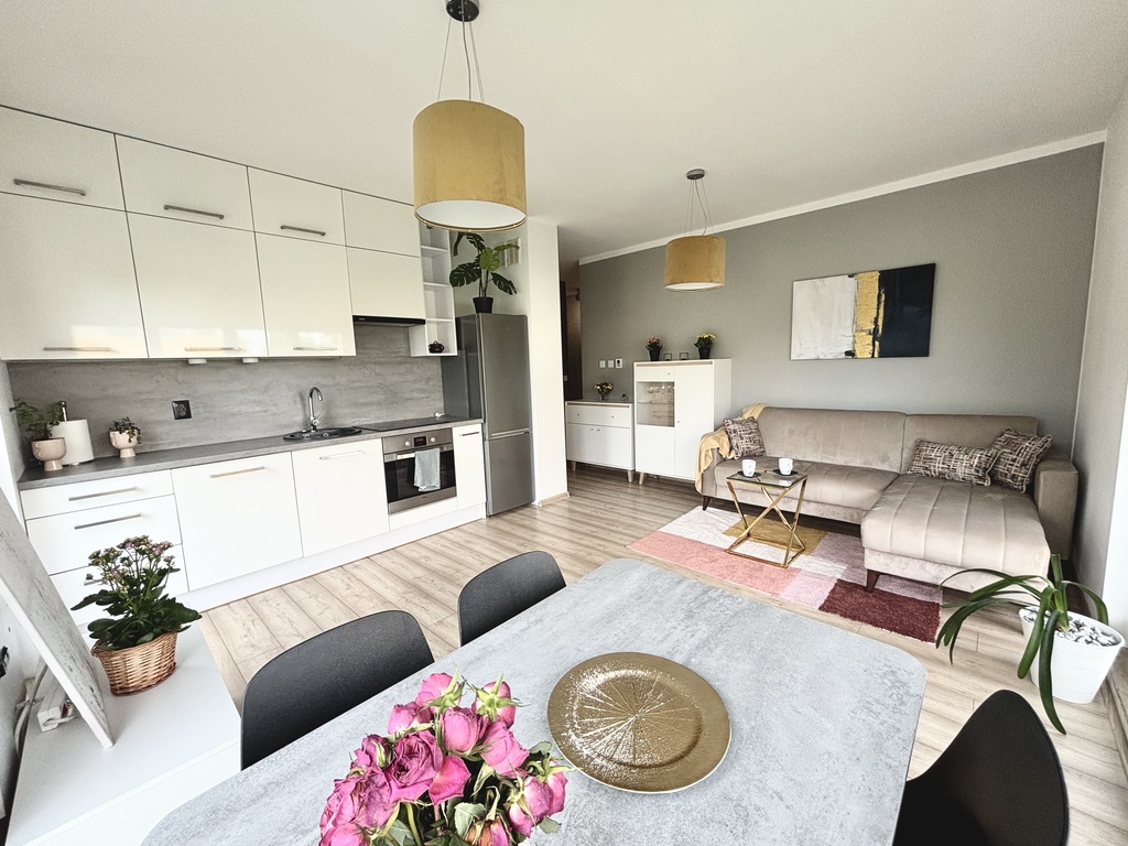 - Salon z aneksem kuchennym (wyposażonym we wszystkie niezbędne sprzęty AGD) i bezpośrednim wyjściem do ogrodu, którego niejeden Ci pozazdrości!