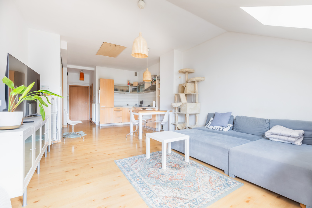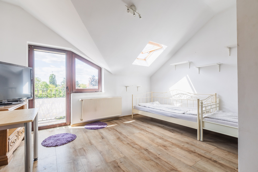 • mieszkanie 50 m² - duży salon z aneksem kuchennym i balkonem, osobno sypialnia i łazienka. Nad mieszkaniem strych, który można adaptować na antresolę