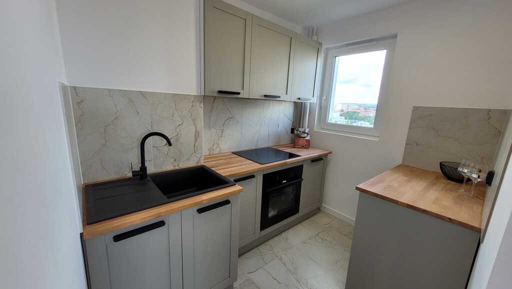 Kuchnia wyposażona w meble oraz sprzęt AGD (nowy piekarnik, płyta indukcyjna oraz okap w zabudowie), możliwość instalacji zmywarki (doprowadzone przyłącza), zlikwidowana instalacja gazowa.