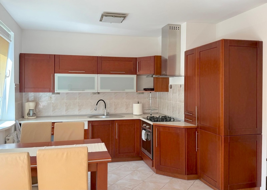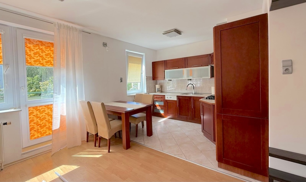 Salon z aneksem kuchennym i częścią jadalnianą – przestronny, jasny, z bezpośrednim wyjściem na balkon. Kuchnia wyposażona w: kuchenkę gazową, piekarnik, okap, zmywarkę, lodówko-zamrażarkę oraz zlewozmywak. W części jadalnianej stół z 4 krzesłami.