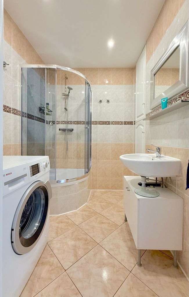 Łazienka – z prysznicem, umywalką z szafką i lustrem, pralką oraz dodatkowymi półkami.