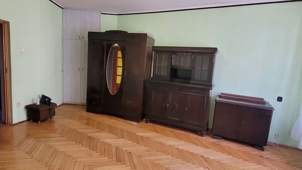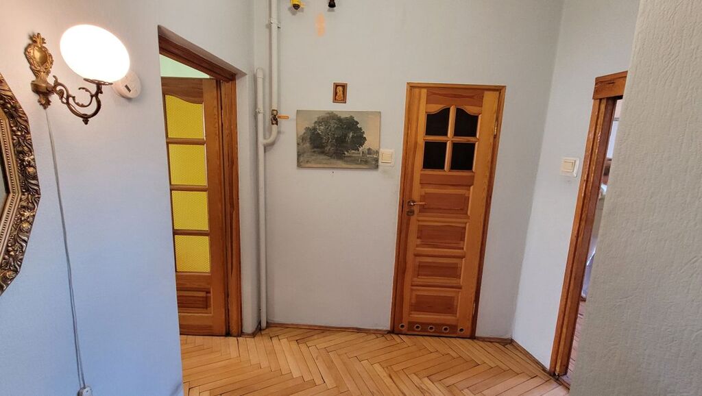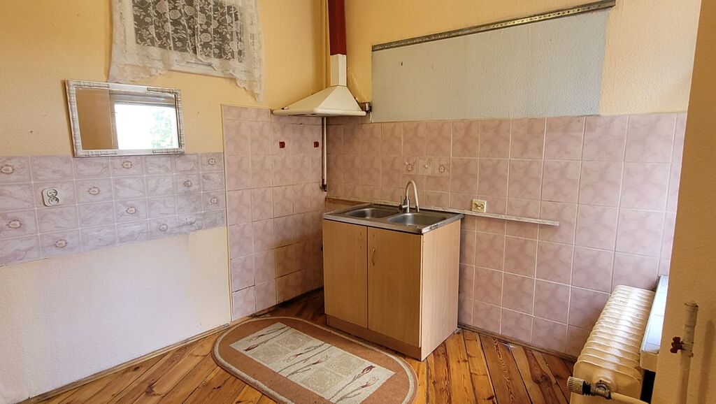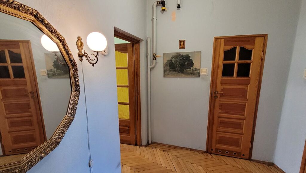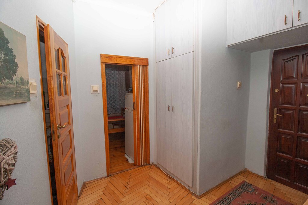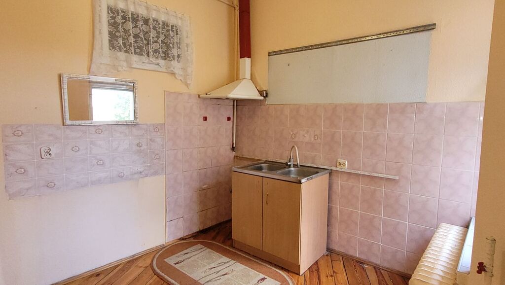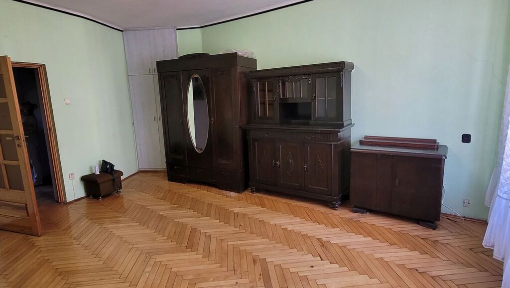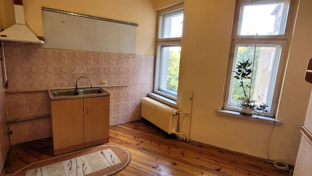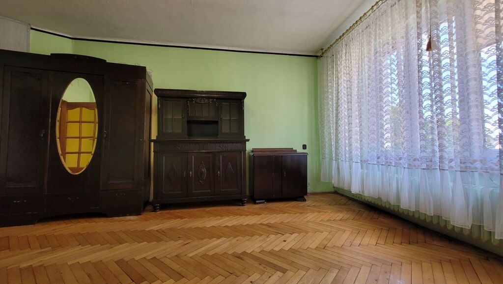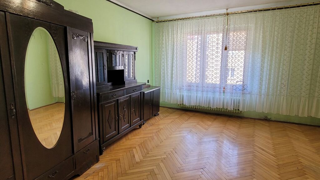 Mieszkanie składa się z dużego pokoju dziennego o powierzchni około 23 m² z oknami PCV i parkietem na podłodze, oddzielnej, widnej kuchni (ok. 9 m²) z drewnianym oknem i deską na podłodze, łazienki w glazurze starszego typu oraz przestronnego przedpokoju z miejscem na szafę w zabudowie. Istnieje możliwość przerobienia kuchni na osobną sypialnię, co czyni mieszkanie atrakcyjnym również dla par lub jako inwestycja pod wynajem.