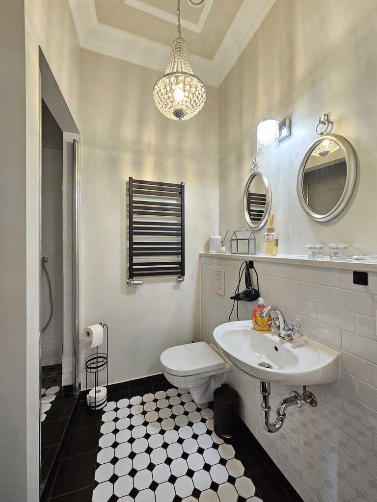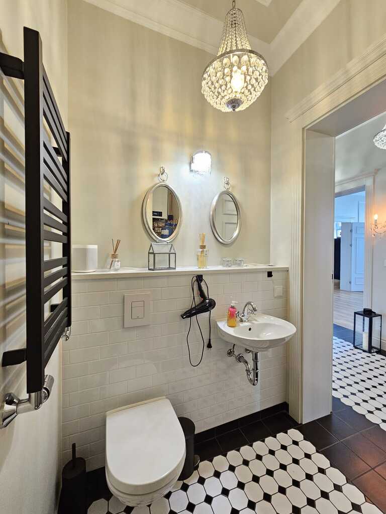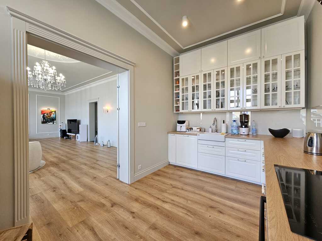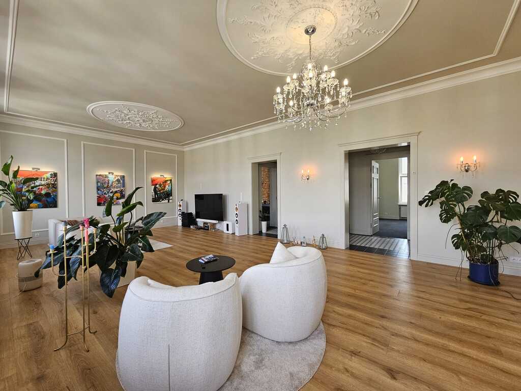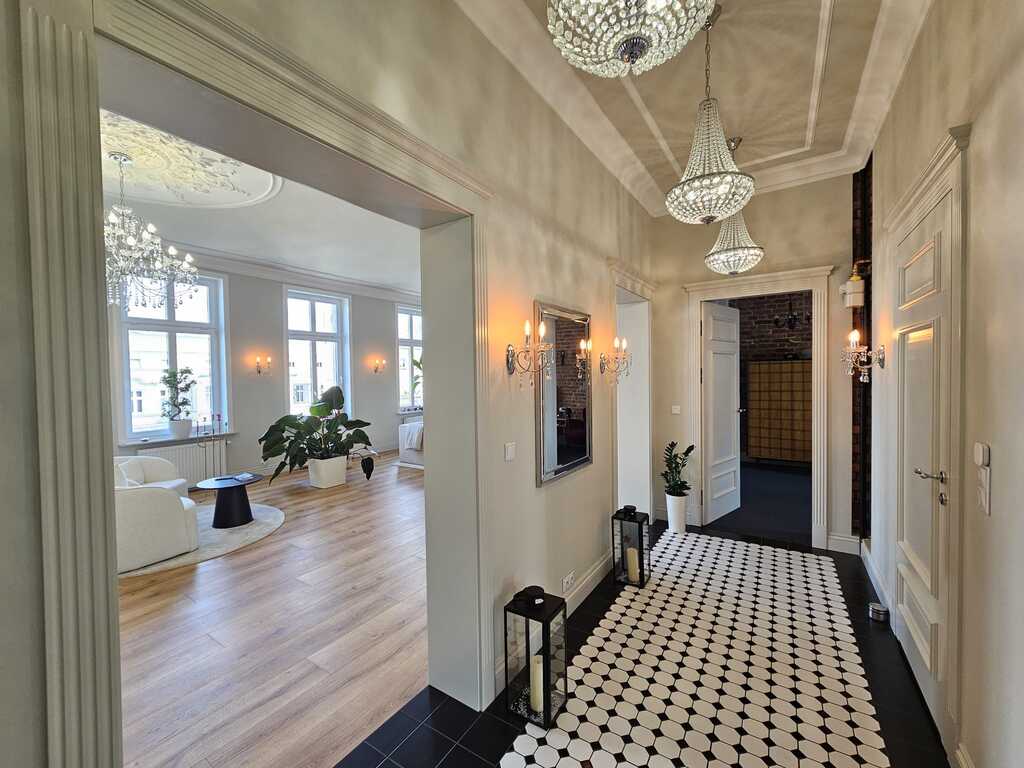 Na podłodze wysokiej klasy panele, w pokojach wykładzina hotelowa, w przedpokoju mozaika. Na ścianach i sufitach liczne gipsowe dekory nadają wnętrzu niesamowitego klimatu. Liczne kinkiety i kryształowe żyrandole podkreślają charakter apartamentu. Robiona na zamówienie stolarka drzwiowa, którą docenią najwybredniejsi klienci.