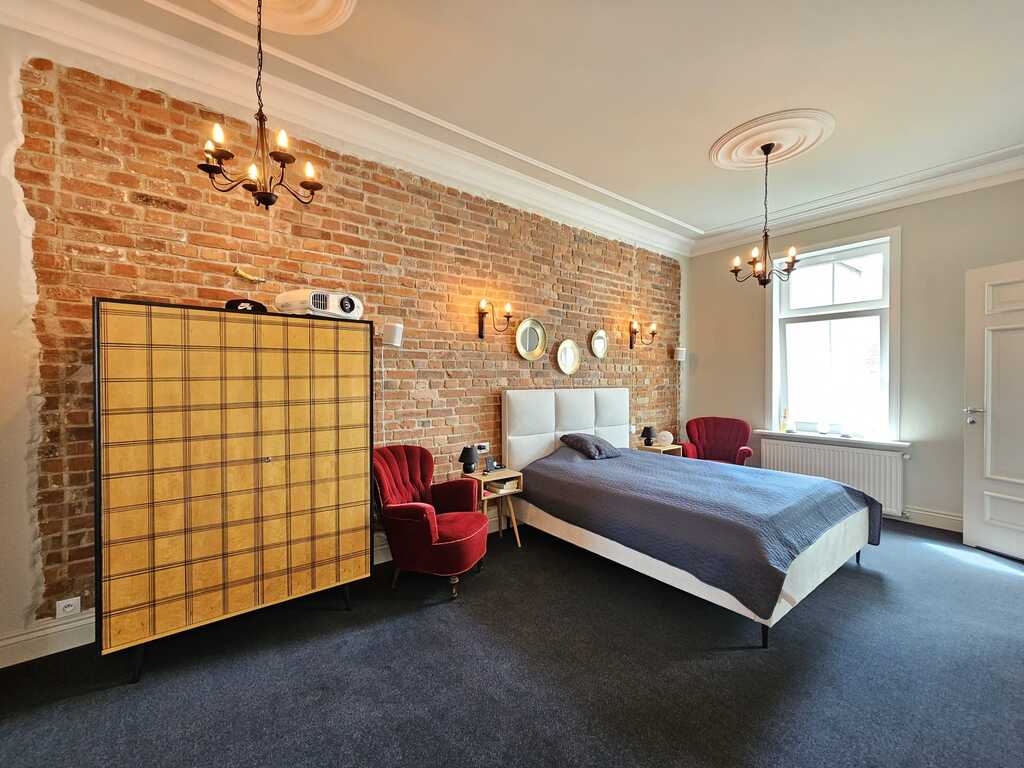 Rozkładowy układ pokoi. Piękny i ogromny salon ok. 50m2, powstały z połączenia dwóch pokoi, bardzo dobrze nasłoneczniony dzięki czterem oknom. Sypialnia z oryginalnie zachowaną ścianą z czerwonej cegły, z miejscem na garderobę i przejściem do prywatnej łazienki z oknem. Mniejszy pokój pełniący funkcję gabinetu. Z salonu przejście do przestronnej w pełni wyposażonej kuchni. Z korytarza wchodzimy do drugiej łazienki, w niej nowy II obiegowy piec gazowy, prysznic, umywalka i wc.