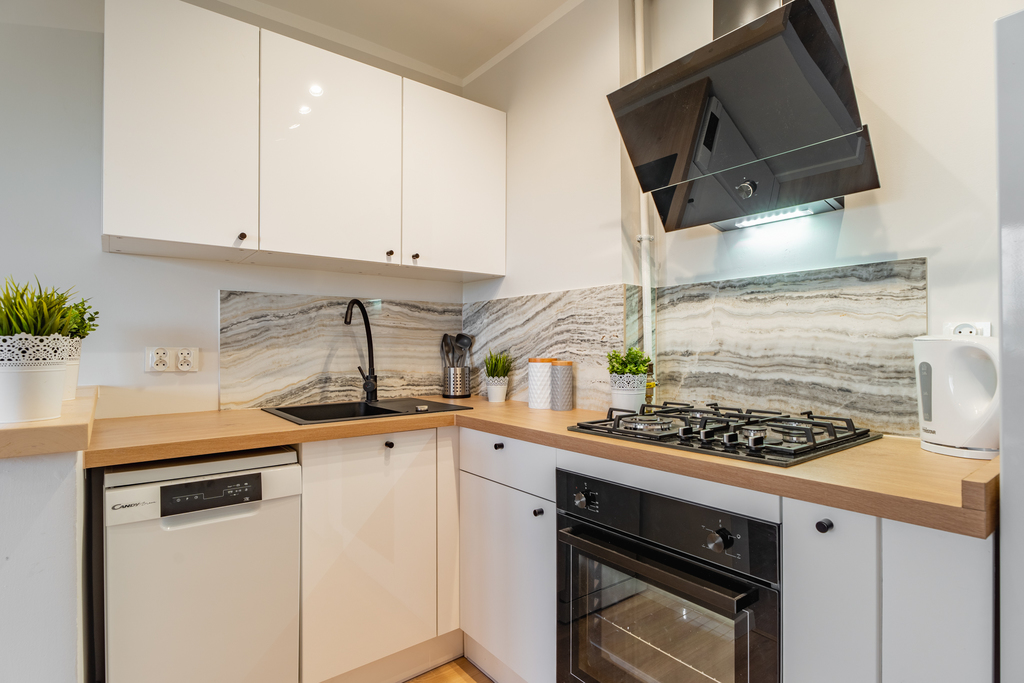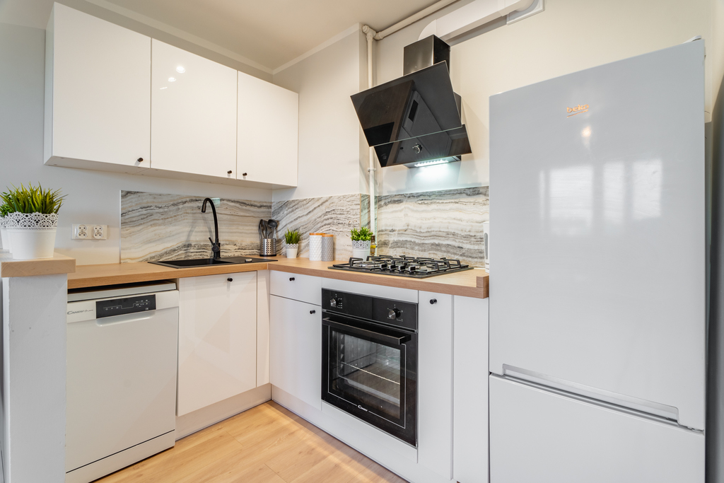 Lokal jest po gruntownym remoncie i w pełni wyposażony w nowe meble, sofę oraz sprzęty AGD (pralka, nowa lodówka, piekarnik, płyta gazowa, okap, zmywarka). W kuchni znajdują się nowe meble w zabudowie.