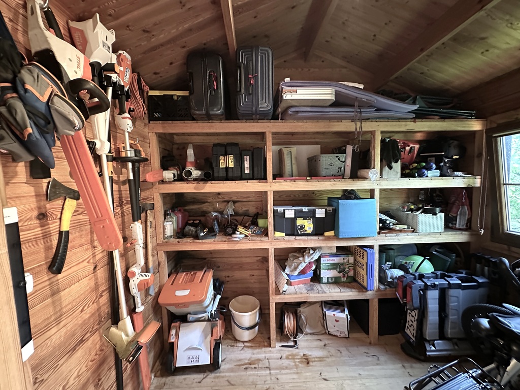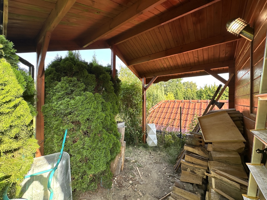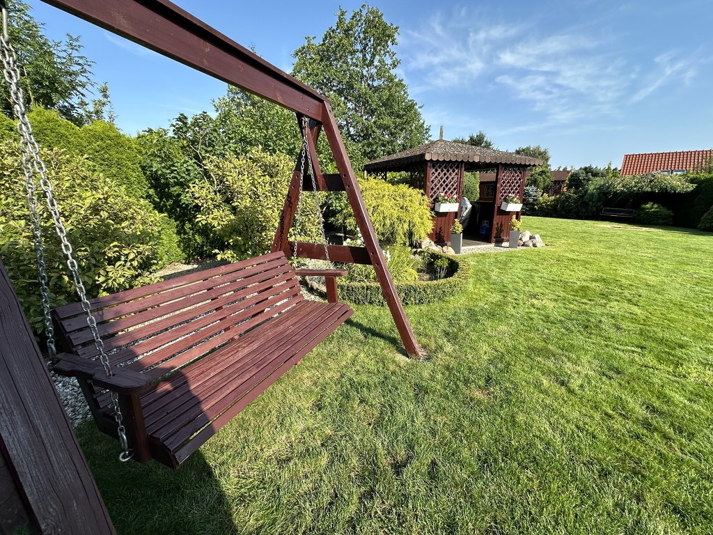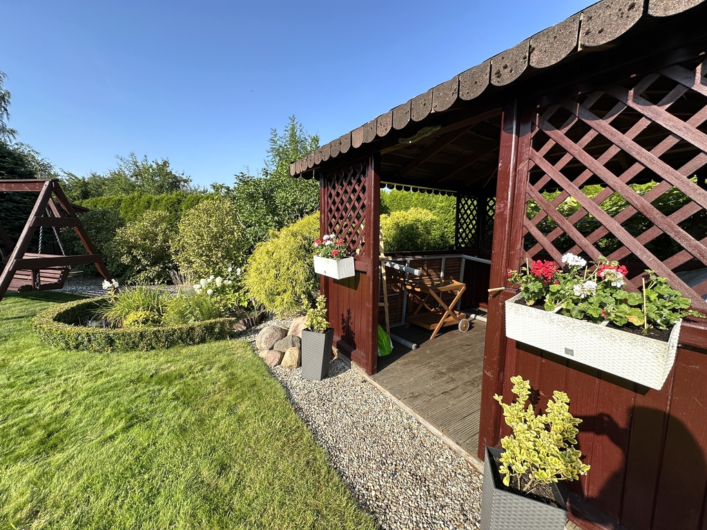 Znajdziesz tu taras, wiatę grillową, huśtawkę, a na końcu ogrodu klimatyczny domek z prądem i kominkiem – obecnie wykorzystywany jako „męska jaskinia” i schowek narzędziowy.