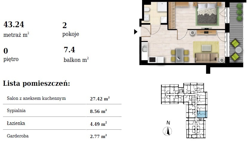 Dwupokojowy przestronny apartament który został wykończony brak w nim tylko mebli i sprzętu. Salon połączony z aneksem o pow. 27.42m2, sypialnia około 9m2, przestronna łazienka z toaletą oraz garderoba około 3m2. Całość nowocześnie wykończona w odcieniach szarości i bieli podłogi wyłożone terakotą imitacja deski, ściany gładź tynkowa, łazienka w glazurze. Duży taras idealny na relaks. Mieszkanie bardzo ekonomiczne w utrzymaniu czynsz ze wszystkimi zaliczkami około 400-500zł miesięcznie.