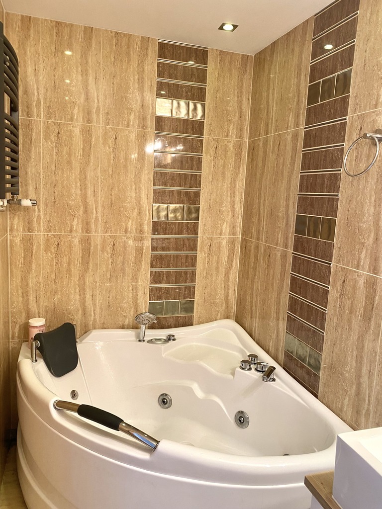Duża łazienka z wanną z hydromasażem oraz dwiema umywalkami – idealna dla rodziny.