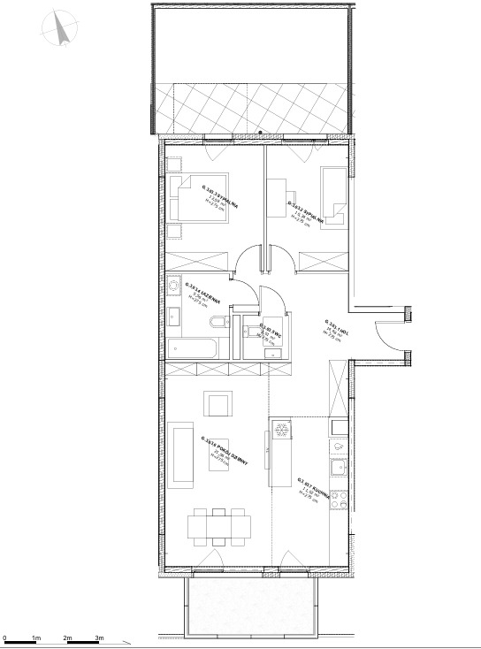 - 2 sypialni (12,58 m2 i 10,34 m2) z wyjściem na taras (9,81 m2) i ogródek (14,70 m2),