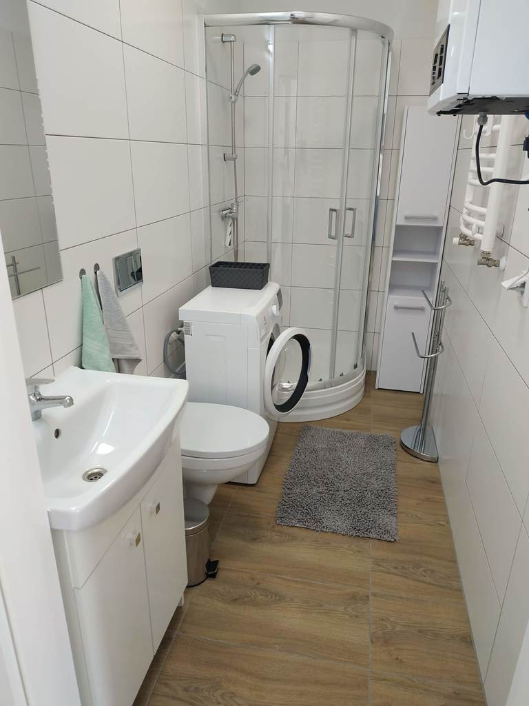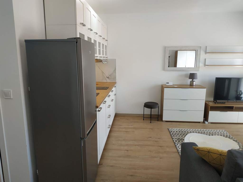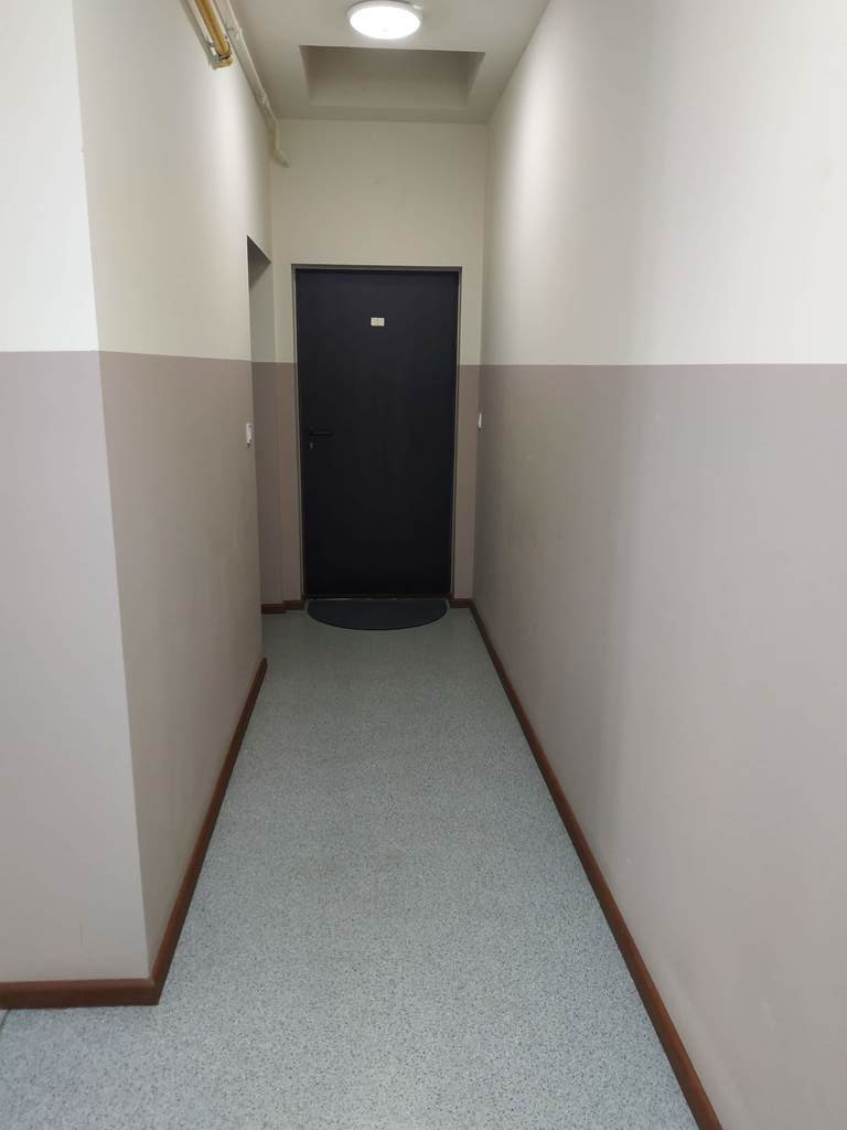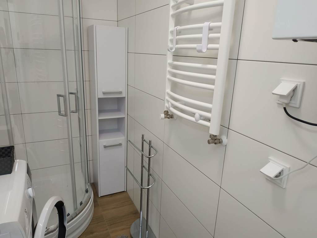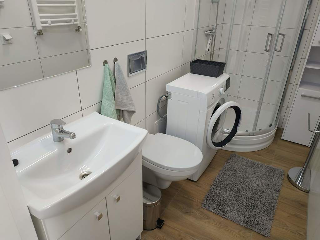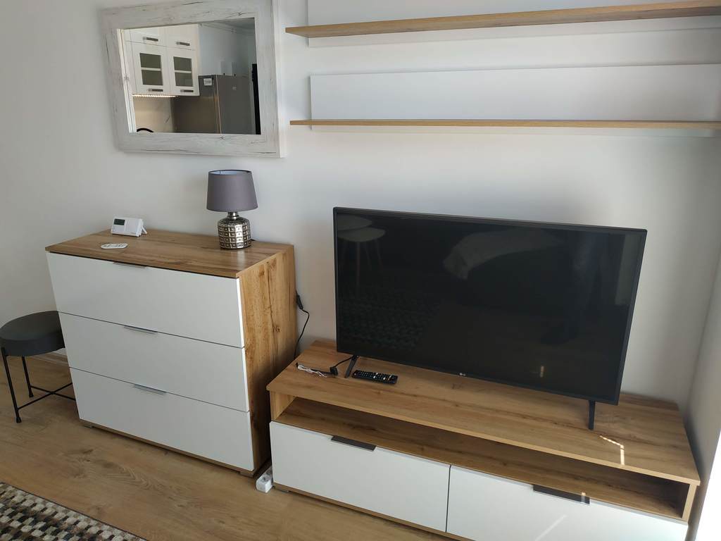 Mieszkanie jest jasne (zamontowano duże okna), przestronne. Składa się z hallu z kuchnią, salonu z wydzieloną częścią jadalną (stół z czterema krzesłami) oraz łazienki z kabiną prysznicową i pralką.