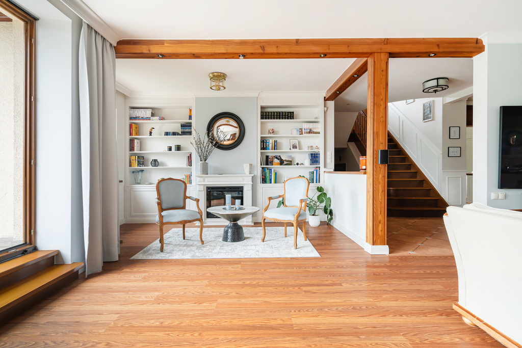 - ogromny, także świetnie doświetlony salon, gdzie znajduje się strefa wypoczynku, część jadalniana oraz otwarty gabinet z piękną zabudową biblioteczną i portalem kominkowym,