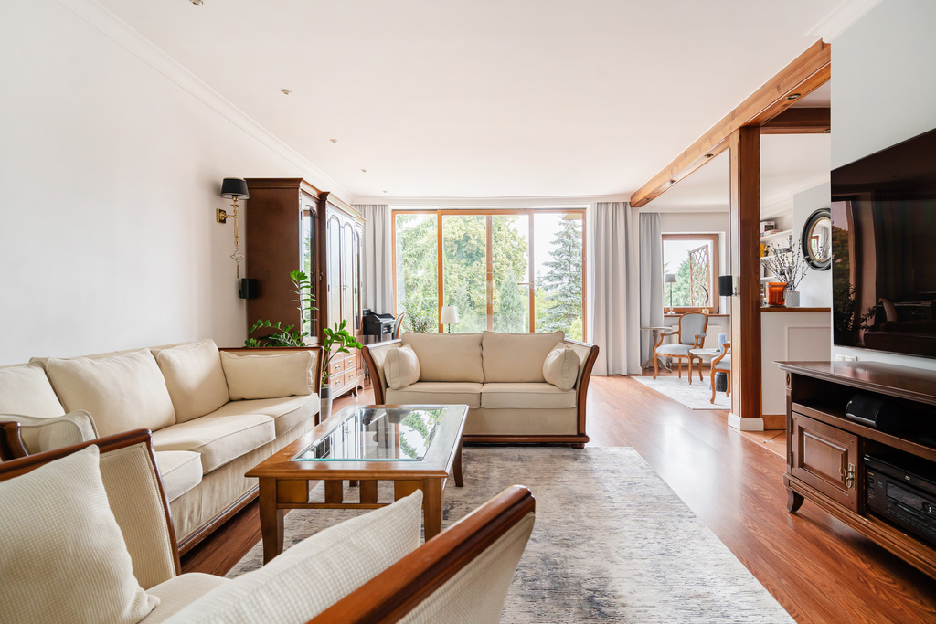 Mieszkanie składa się z 4 pokoi, kuchni, 2 łazienek, pomieszczenia na pralnię, piwnicy, garażu na dwa samochody w bryle budynku oraz ogrodu. Poniżej szczegółowy opis.
