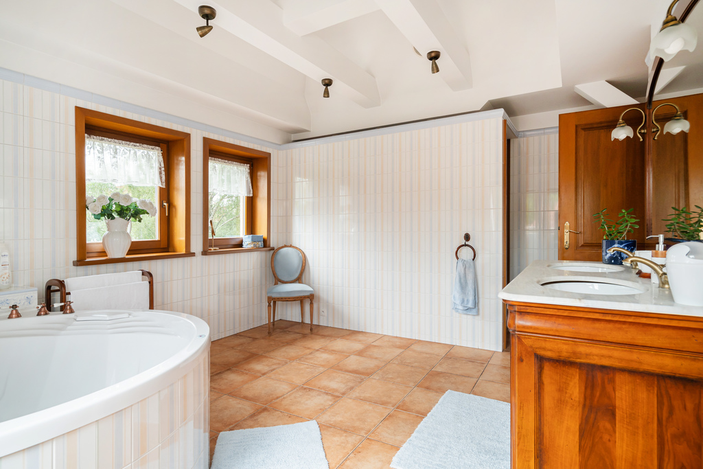 - pokoju kąpielowego z oknami, w jasnych barwach hiszpańskich kafli, wyposażonego w dwuosobową wannę, WC, dwie umywalki oraz wejściem do pomieszczenia przeznaczonego na pralnię z dużą ilością miejsca do przechowywania