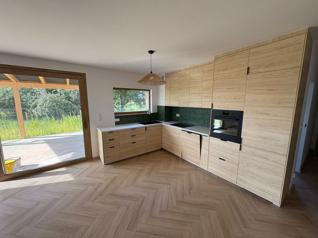 Nowoczesne wykończenie: podłoga ułożona w jodełkę, elegancka zabudowa kuchenna z piekarnikiem i zmywarką, czarna armatura, duże okna