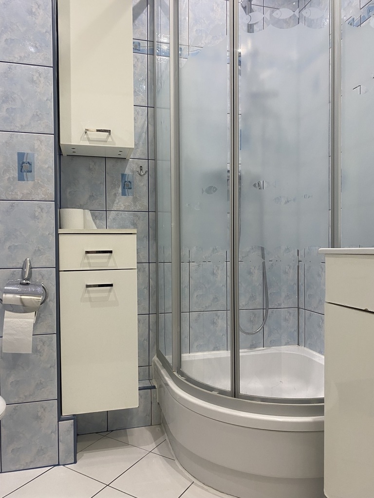 - łazienka z kabiną prysznicową z umywalką oraz wc w glazurze i terakocie