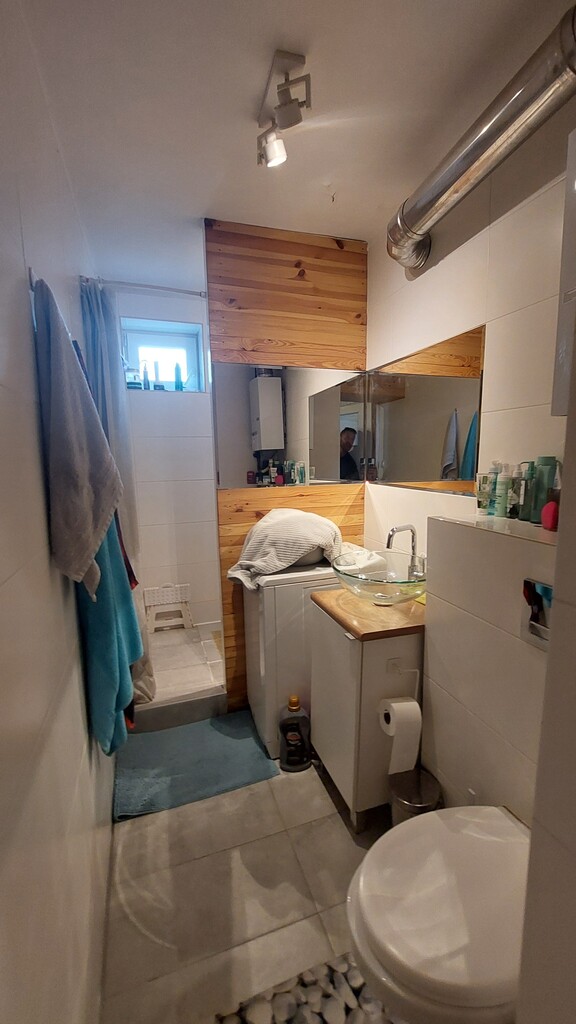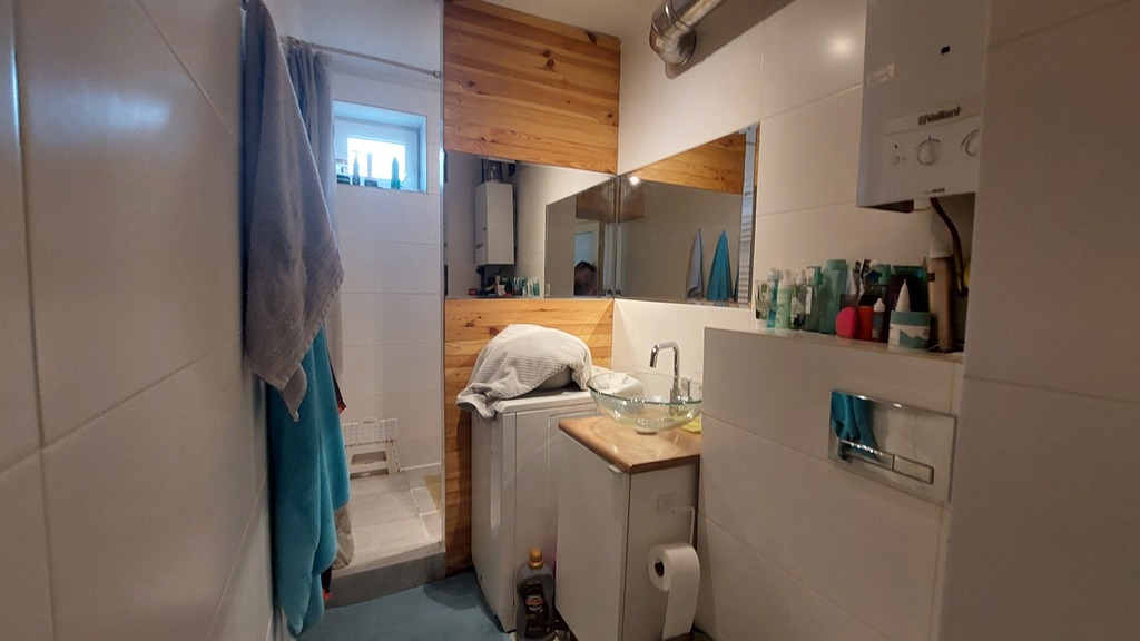 - łazienka razem z WC z oknem wyposażona w kabinę prysznicową w nowoczesnej glazurze i terakocie,