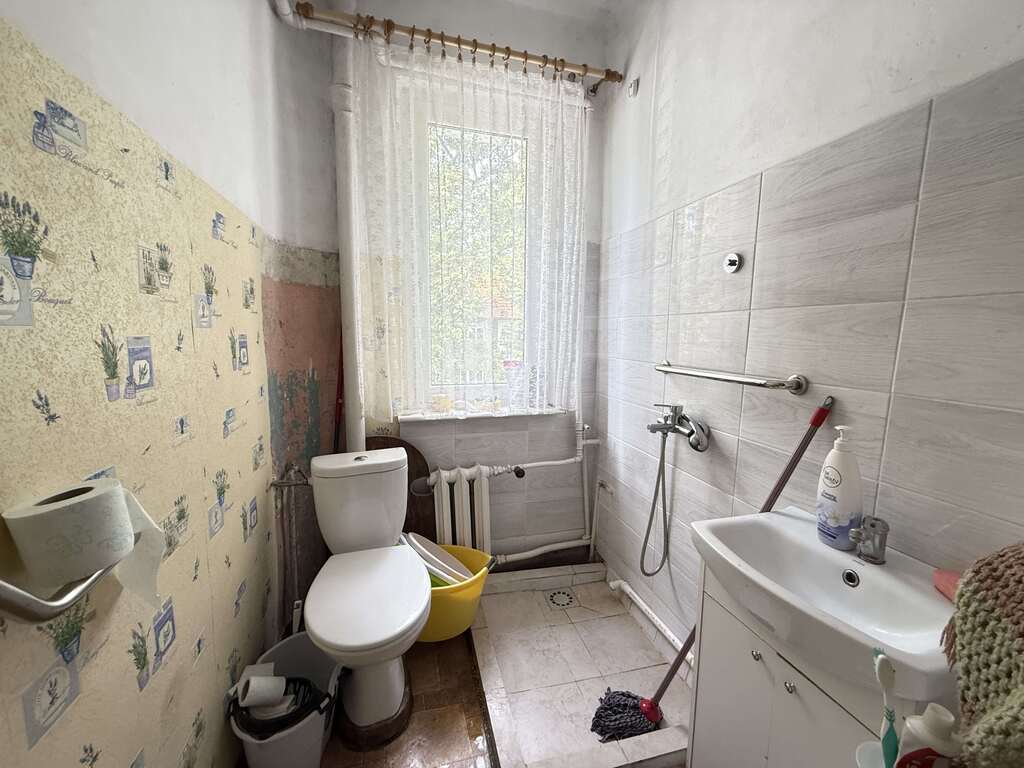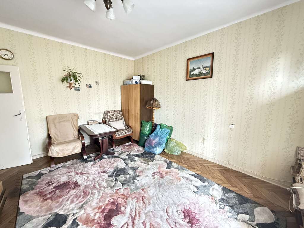 Dwa duże pokoje (jeden od ulicy, drugi /większy/ od podwórka, przestronna kuchnia z wyjściem na duży balkon od strony podwórka z widokiem na zieleń, łazienka z oknem.