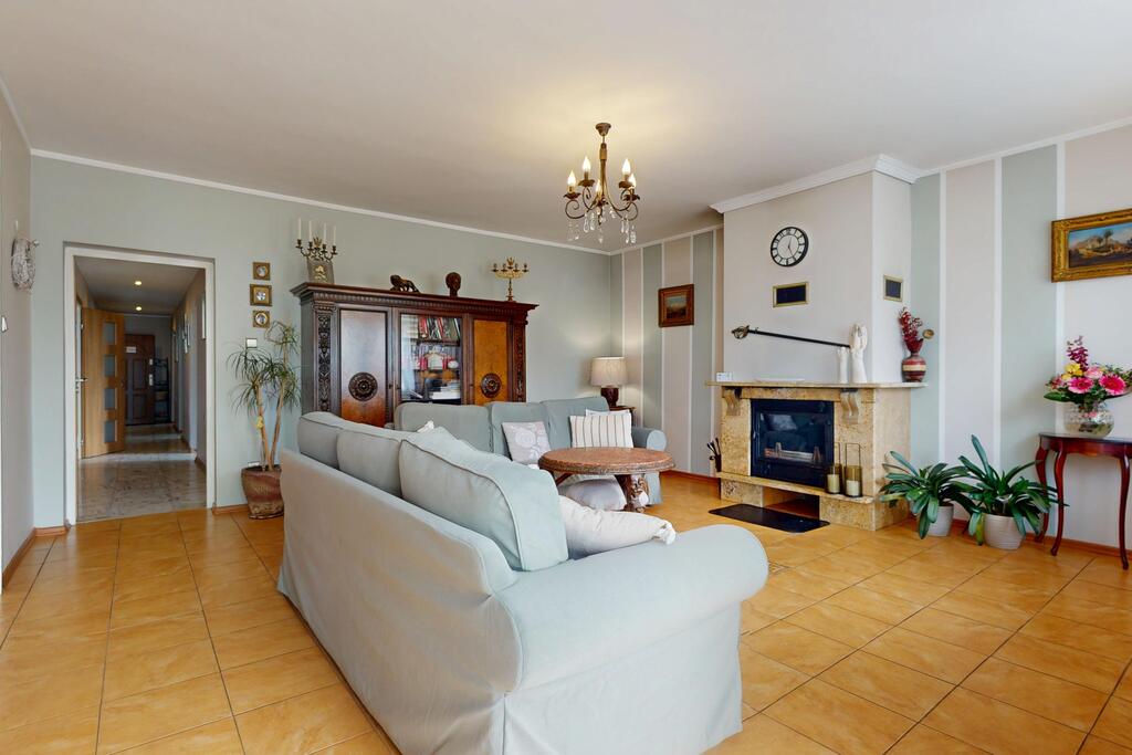 Przestronny salon z kominkiem i otwartą kuchnią