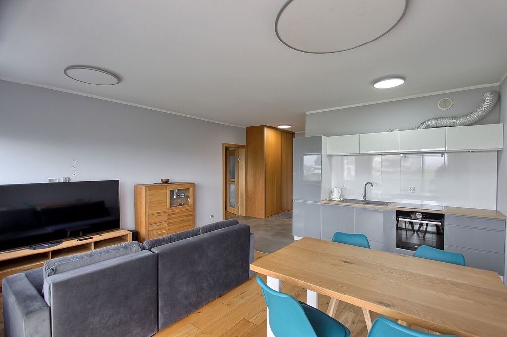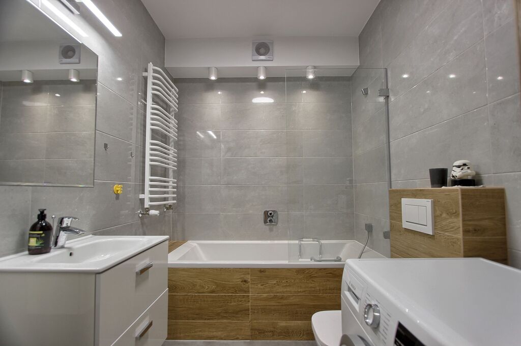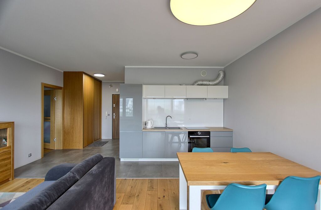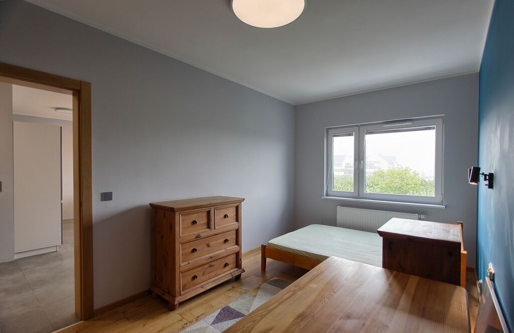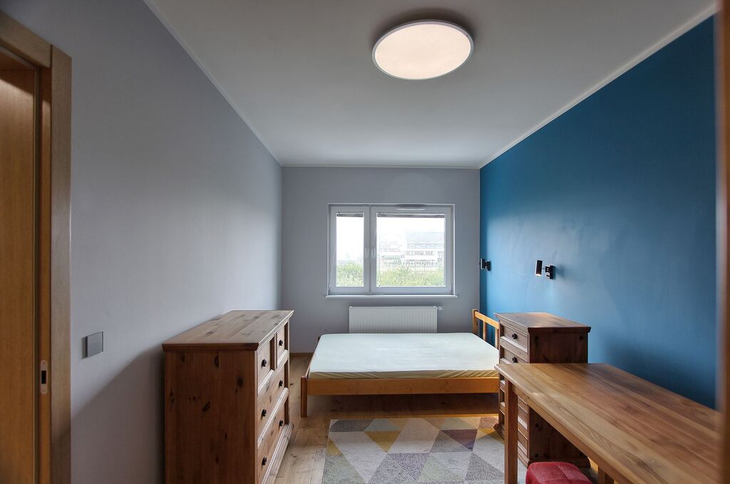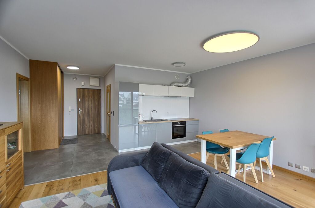 Mieszkanie jest w pełni umeblowane: kuchnia w zabudowie (lodówka, zamrażarka, piekarnik, okap, zmywarka, płyta indukcyjna), stół z krzesłami, kanapa, łóżko, biurko, liczne komody i szafy do przechowywania. W łazience wanna z przesłoną prysznicową oraz pralka.