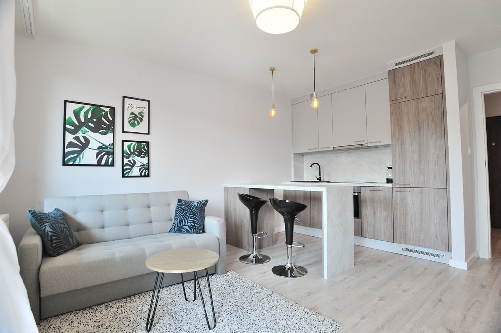 OPIS: Mieszkanie składa się z: dziennego pokoju z aneksem kuchennym, wejściem na duży balkon, sypialni, łazienki z wanną i wc oraz garderobą w korytarzu. Pokój umeblowany w szafkę pod TV, stolik kawowy, dużą wygodną sofę rozkładaną, telewizor. Przestronna łazienka z wanną, wc, umywalką i pralką. Kuchnia została umeblowana w nowe meble i wyposażona w sprzęt AGD: kuchenkę, okap, lodówkę z zamrażarką, piekarnik elektryczny i nową zmywarkę.