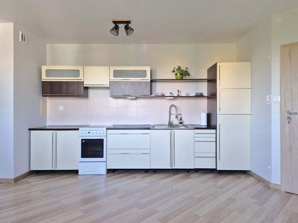 * salon z aneksem kuchennym. Aneks z meblami kuchennymi, kuchenką elektryczną z piekarnikiem oraz lodówką z zamrażalnikiem.