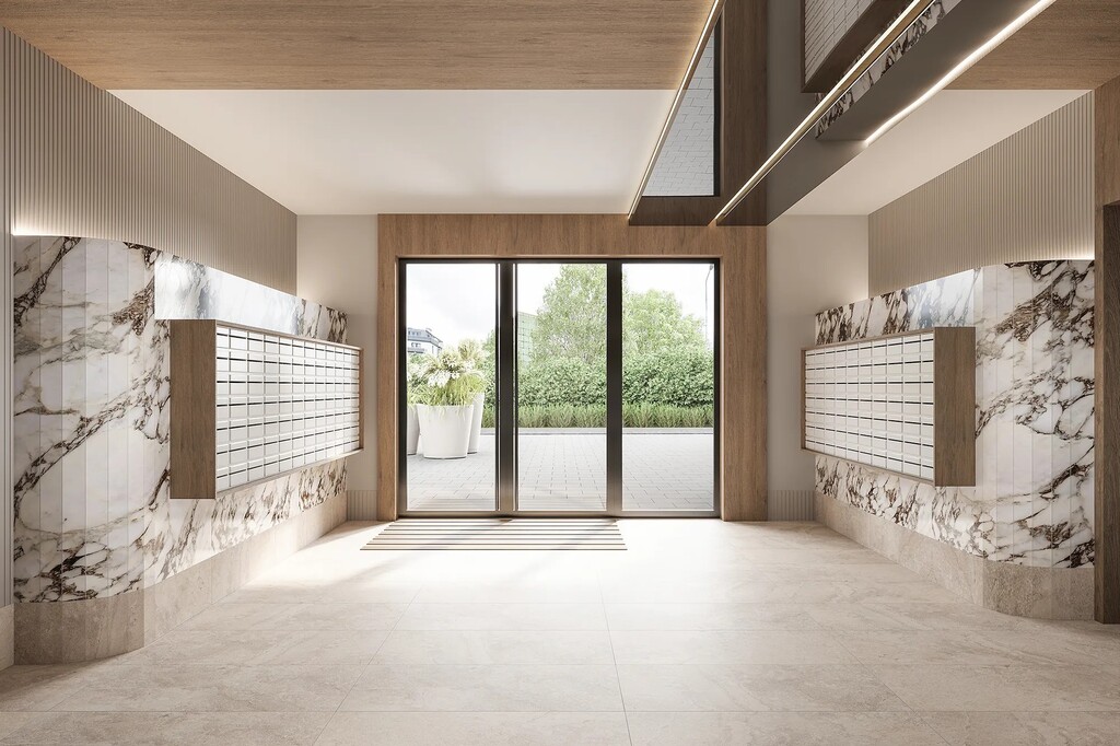 Wnętrza części wspólnych zaprojektowano w jasnej tonacji, podkreślającej nowoczesny styl oraz wyjątkowy charakter tego miejsca. Zastosowane rozwiązania ekologiczne nie tylko dbają o środowisko, ale także podnoszą komfort codziennego życia, tworząc przestrzeń sprzyjającą odpoczynkowi, pracy i integracji.