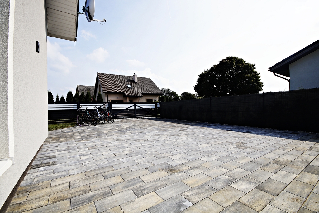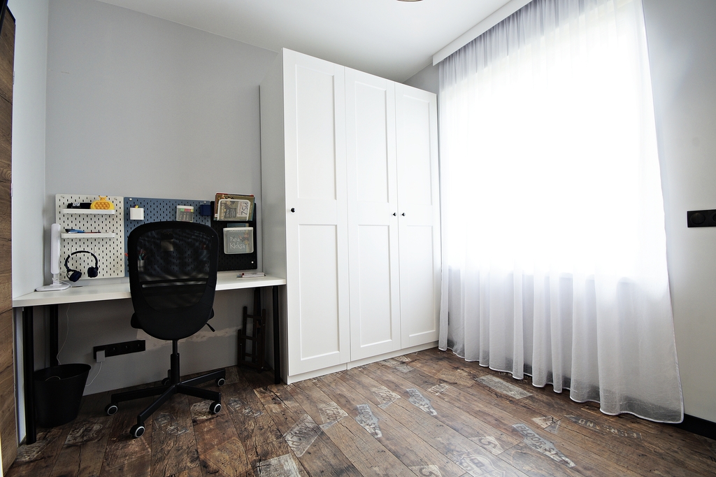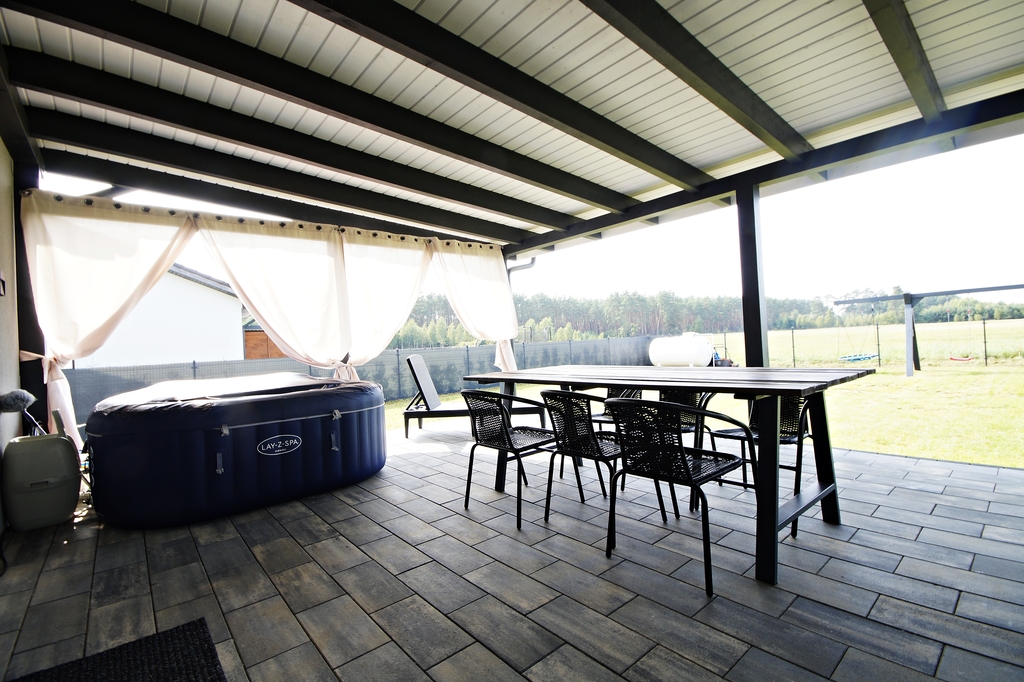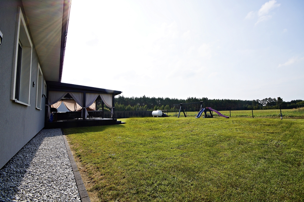 Dom o powierzchni użytkowej 106,6 m² składa się z 5 przestronnych pokoi, w tym dużego salonu połączonego z aneksem kuchennym oraz 4 sypialni. Z salonu jest bezpośrednie wyjście na słoneczny taras, gdzie można cieszyć się widokiem na otaczającą zieleń.