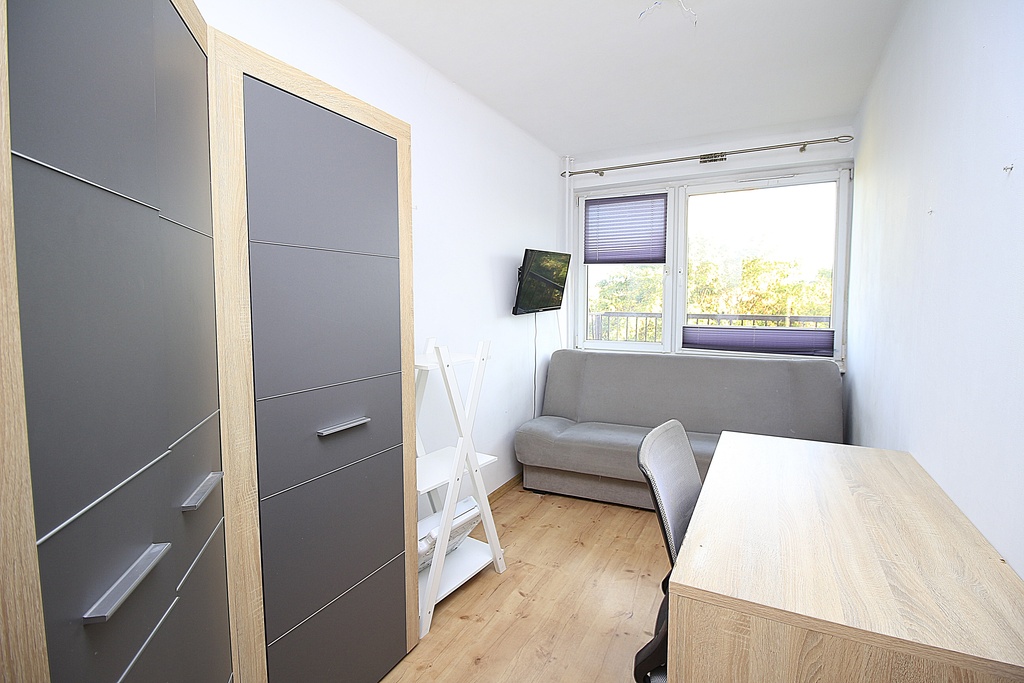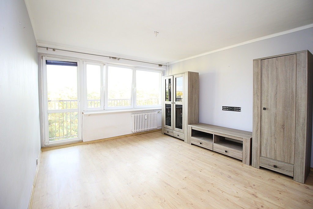 * salon z wyjściem na balkon, widok na zieleń, brak okien na przeciwko