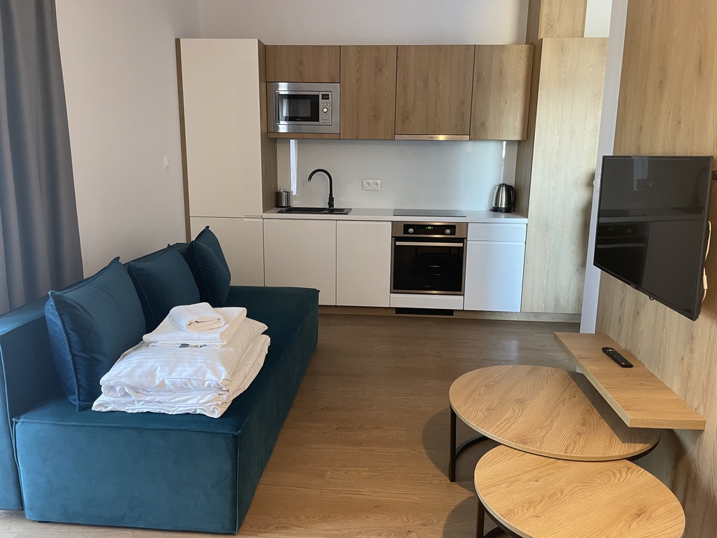 Apartament wykończony w wysokim standardzie, z klimatyzacją i centralnym ogrzewaniem. Na wyposażeniu m.in.: telewizor, internet, pralka, lodówka, zmywarka, piekarnik, kuchenka, mikrofalówka.