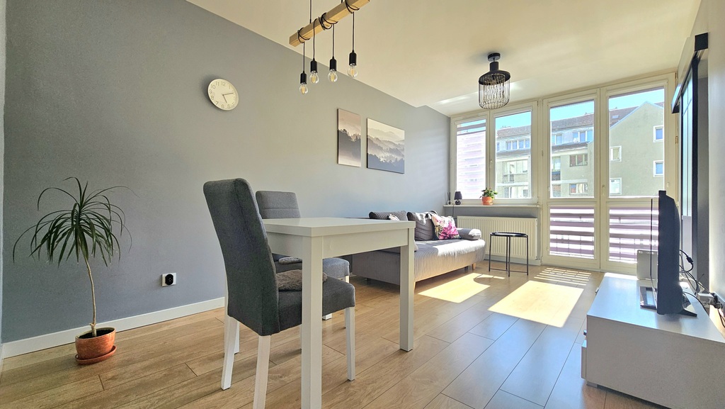 Układ: jasny salon z częścią wypoczynkową oraz jadalnianą, osobna sypialnia, kuchnia z zabudową i sprzętami AGD, łazienka z prysznicem, garderoba,