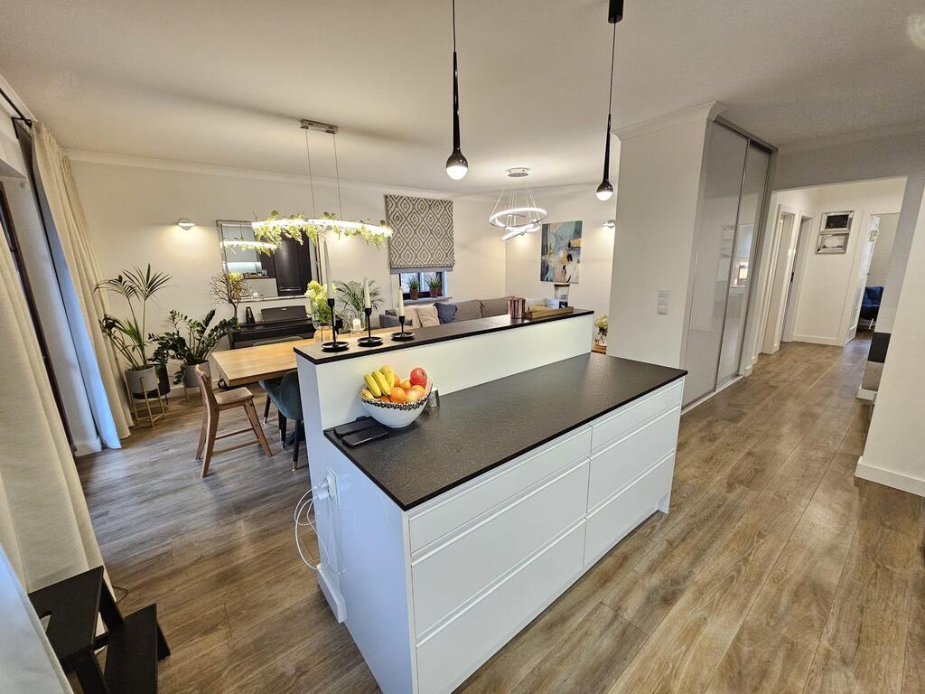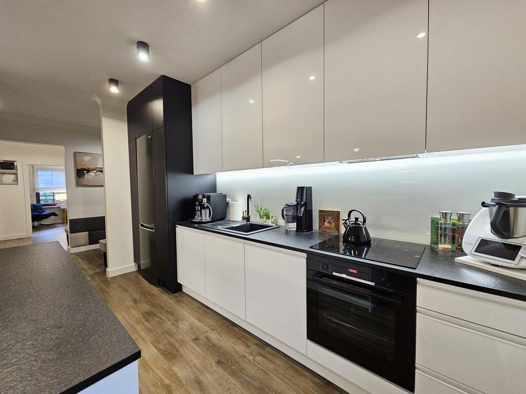 Kuchnia w połysku, wyposażona w sprzęty agd jak: zmywarka, piekarnik, okap, płyta indukcyjna, lodówko-zamrażarka. Zastosowano grafitowy blat kamienny i ledy pod szafkami.