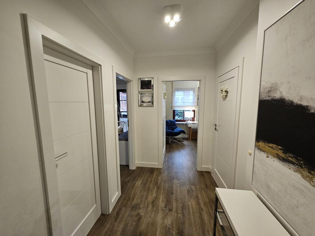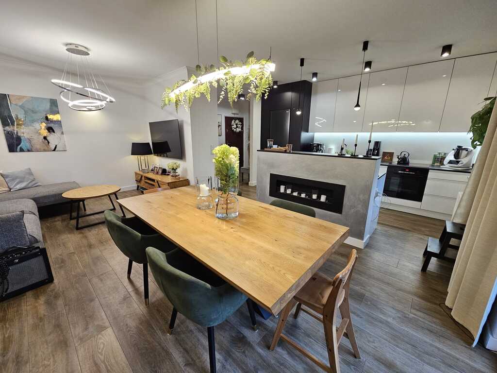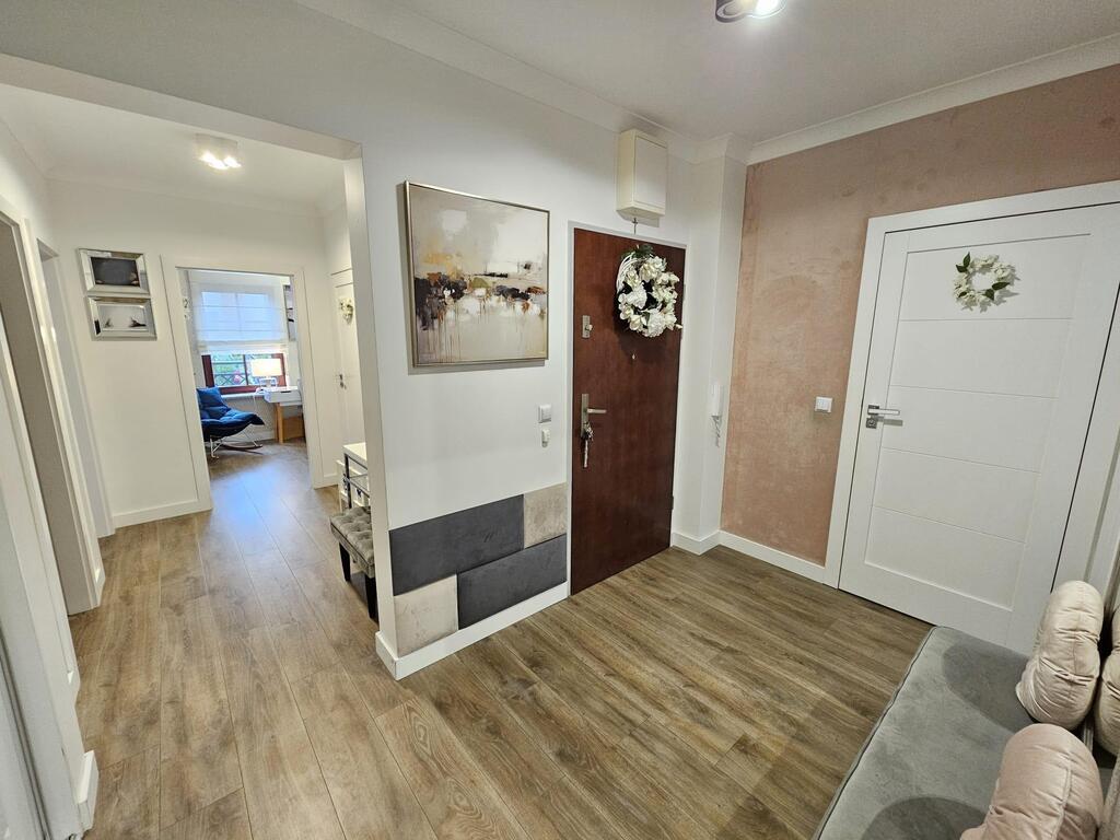 Apartament zadbany, zaaranżowany przez projektanta wnętrz w ciepłej kolorystyce. Uroku dodają drewniane okna z granitowymi parapetami. Wystawa okienna salonu i sypialni południowa, dwóch pokoi północna. W całym mieszkaniu na podłodze panele winylowe. We wszystkich oknach rolety antywłamaniowe. W pomieszczeniach drzwi bezprzylgowe firmy Porta. Liczne oświetlenie dekoracyjne.
