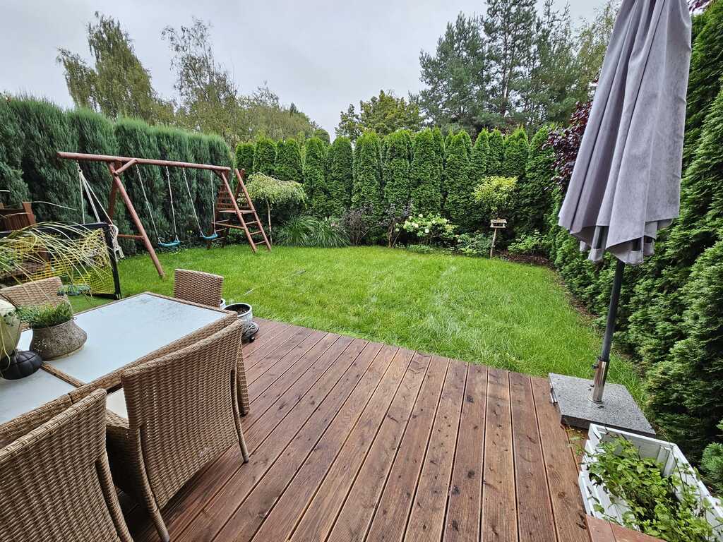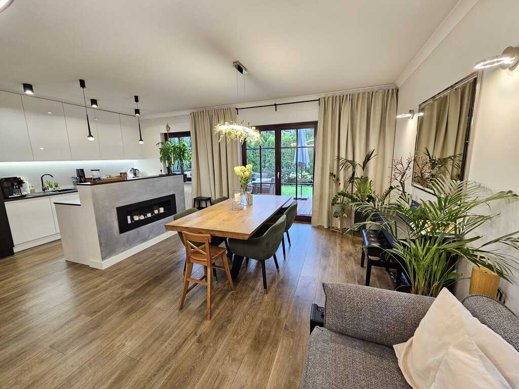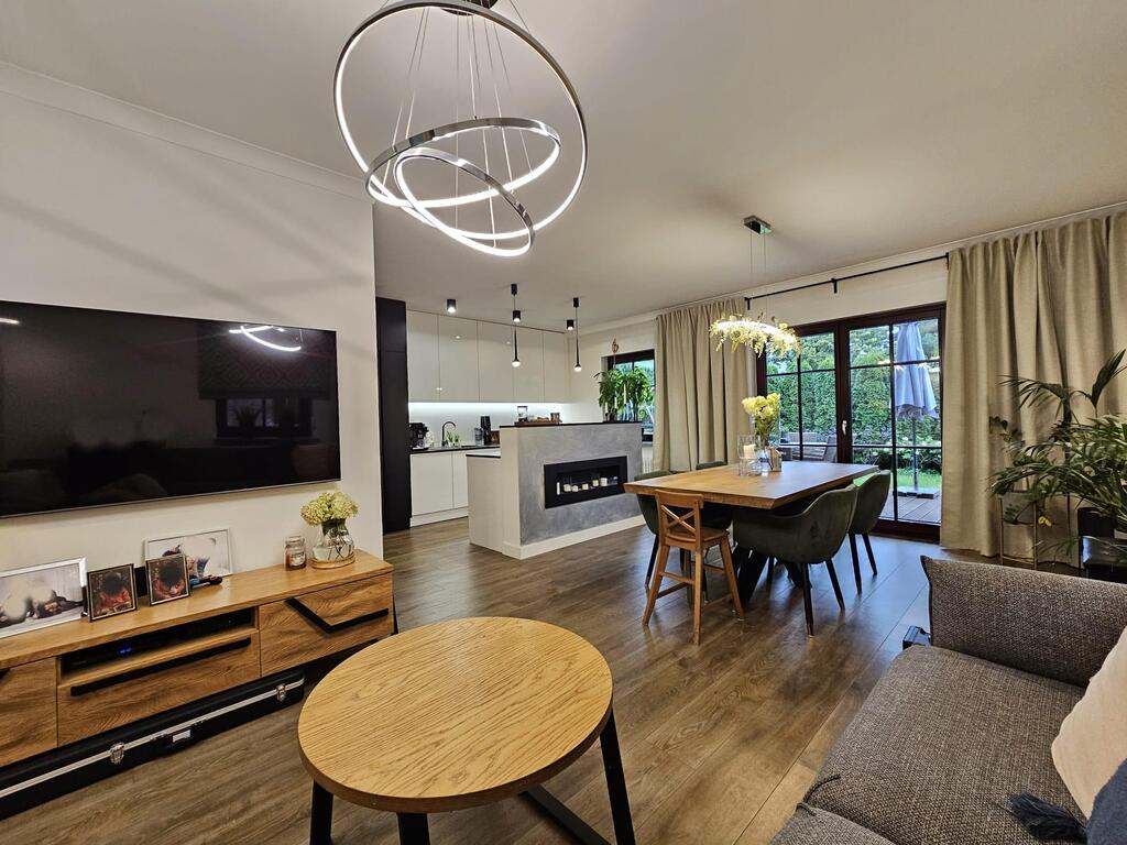 Z salonu wyjście na słoneczny taras 15m2 z ogródkiem o powierzchni 85m2. Część dzienna oddzielona od kuchni "wyspą" z biokominkiem.