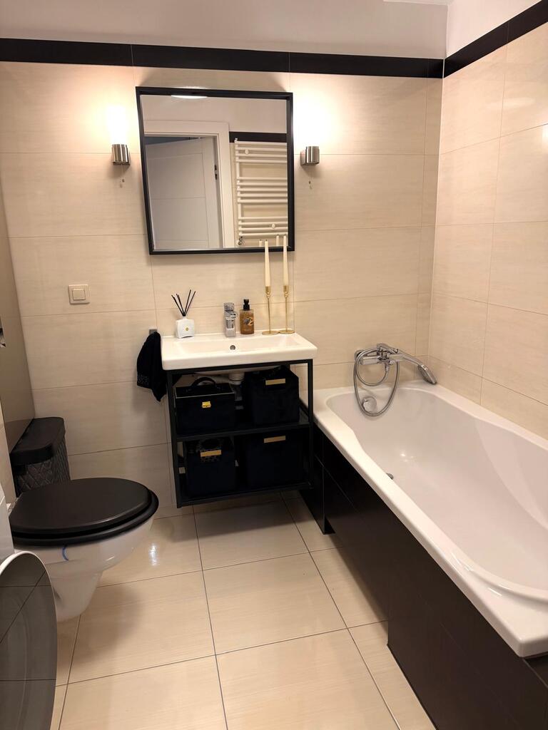 Łazienki wyposażone w wannę, prysznic, umywalkę, wc oraz wnękę na pralkę.