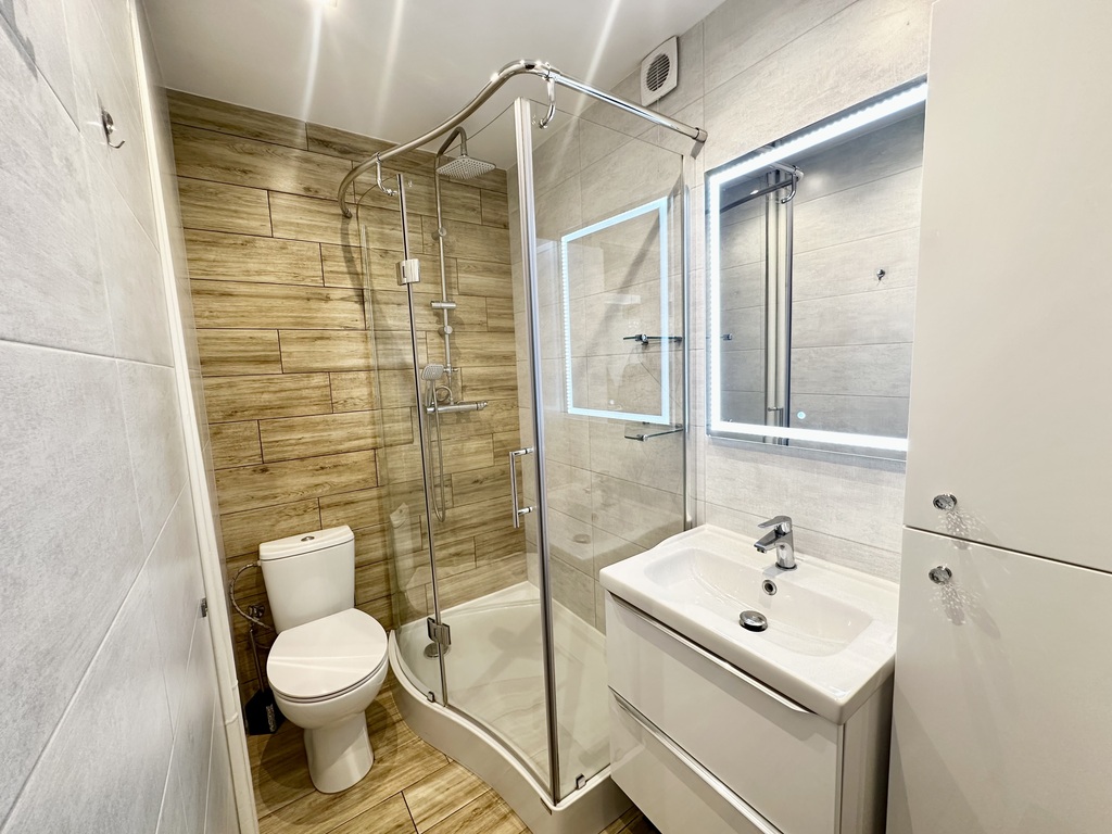 Łazienka z prysznicem, umywalką i WC