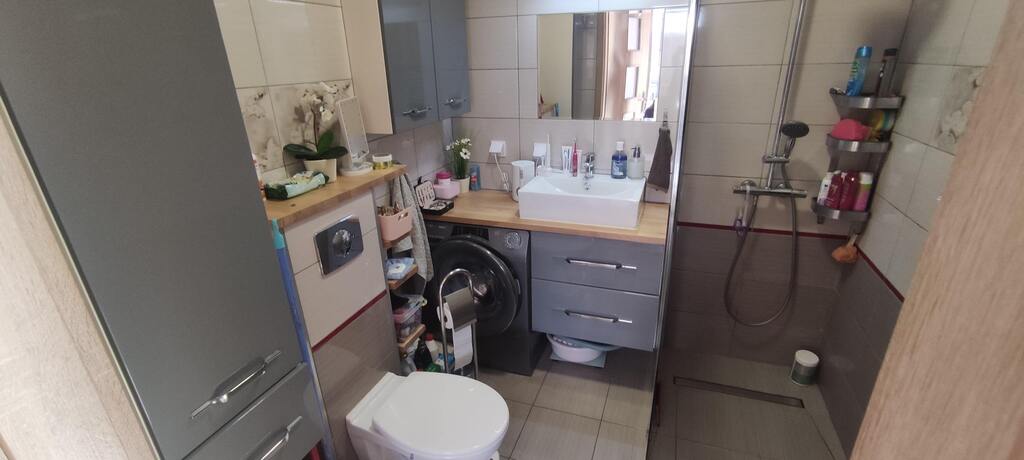 Łazienka razem z WC o pow. 4,2m2 w glazurze i terakocie z kabiną prysznicową.